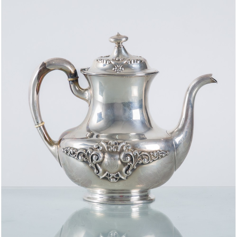Caffetteria di epoca Vittoriana in argento sterling cesellato e sbalzato.