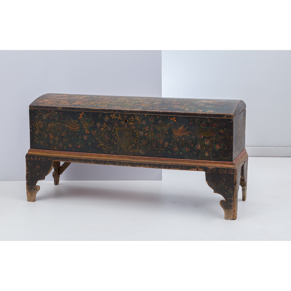 Cassapanca in legno di abete laccata a fondo verde con decorazioni floreali