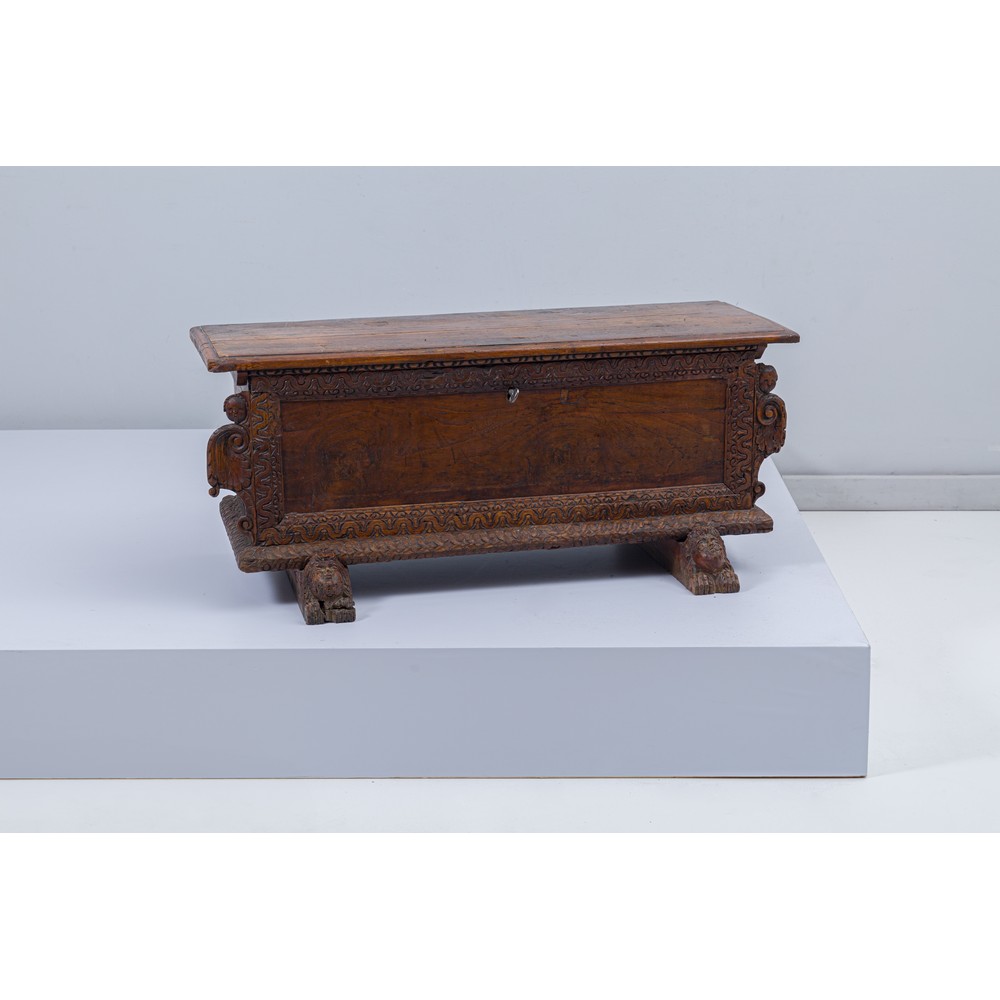 Cassapanca in legno di noce intagliato con basi scolpite raffiguranti "Arpie"