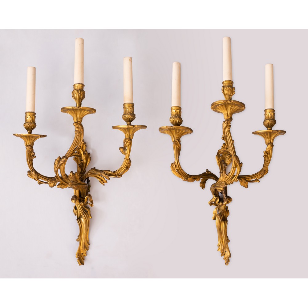 Coppia di applique Luigi XV elettrificati a tre fiamme in bronzo dorato a mercurio.