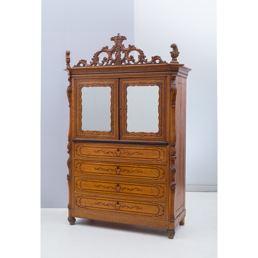 Chiffonier di epoca Carlo X in legno lastronato in acero e perfilato in legno di rosa, composta da quattro cassetti nella parte inferiore, anta centrale a due sportelli con specchio e tre piccoli cassetti interni nella parte superiore, cimasa in legno intagliato e scolpito (usure e mancanze).
