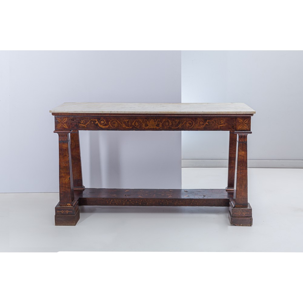 Consolle di epoca Carlo X in legno con tarsie e perfili in bosso, base in marmo bianco di Carrara