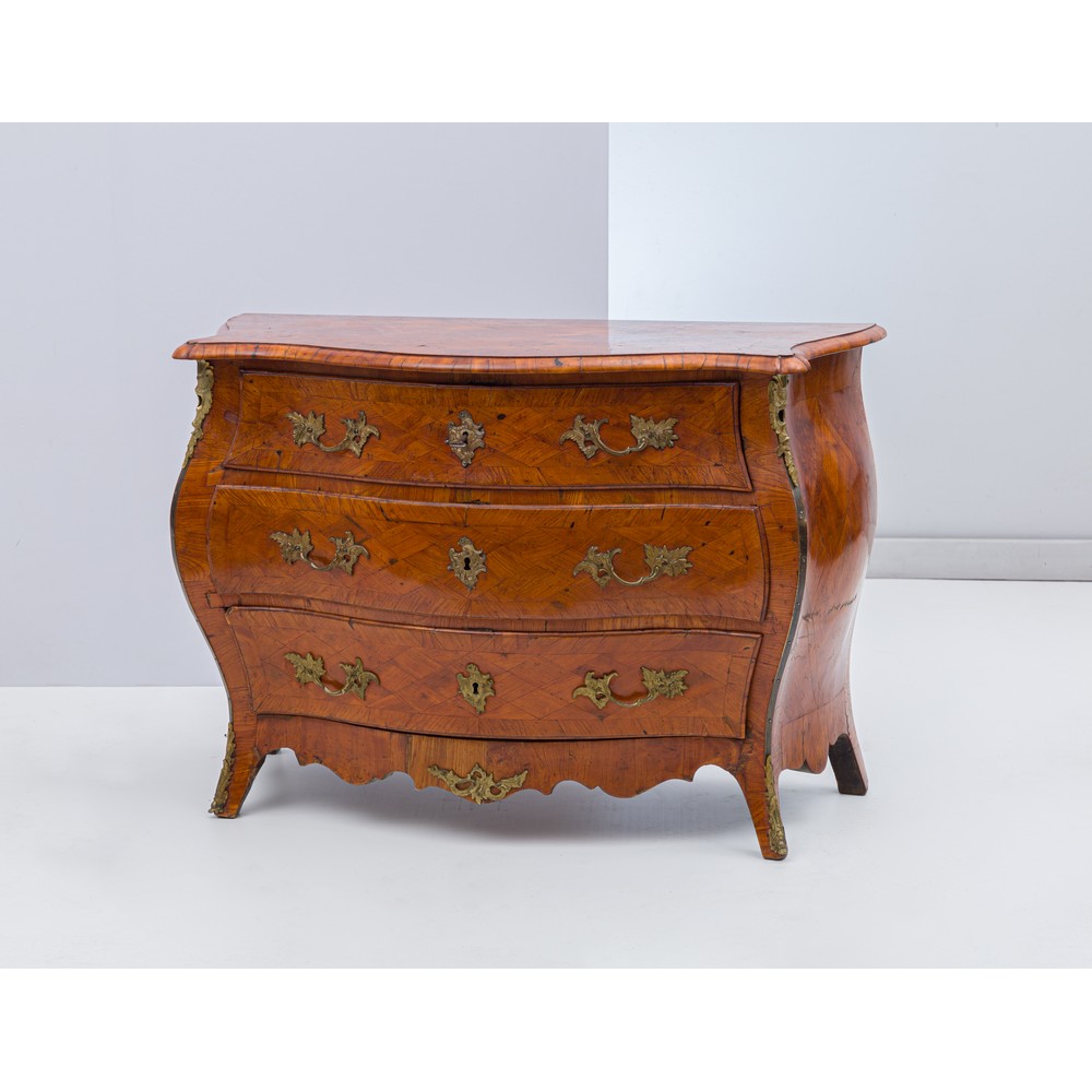 Cassettone di epoca Luigi XV a tre cassetti in legno lastronato a decori romboidali con maniglie e fregi in bronzo cesellato e dorato