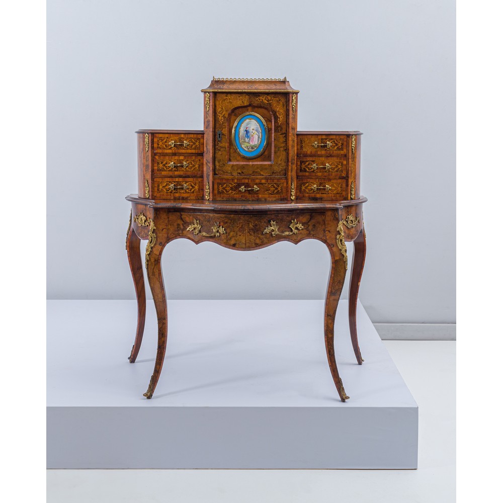 Bonheur du jour con cassetto centrale, sportello con medaglione in porcellana di Sevres dipinto a mano con sette cassettini raffigurante "Scena galante" in legno di noce e radica di noce, tarsie in bosso con maniglie e fregi in bronzo dorato.