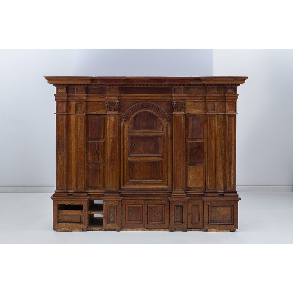 Armadio da sacrestia, parte superiore del mobile realizzato in legno di noce composto da anta centrale curva sulla sommità, due ante speculari rettangolari divisi dalla centrale da lesene sormontate da capitelli corinzii, piccoli sportelli alla base con mancanze.