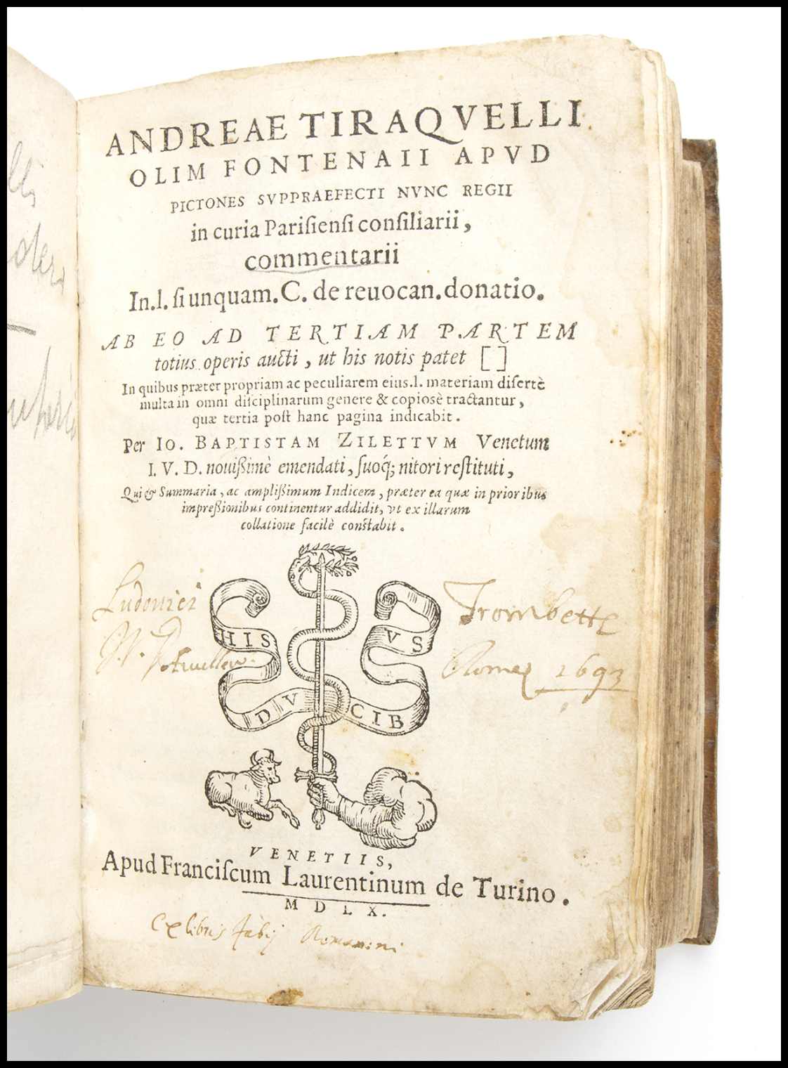 Andreae Tiraquelli olim Fontenaii apud Pictones suppraefecti nunc regii in curia Parisiensi consiliari Commentari..., Venetiis : apud Franciscum Laurentinum de Turino, 1560