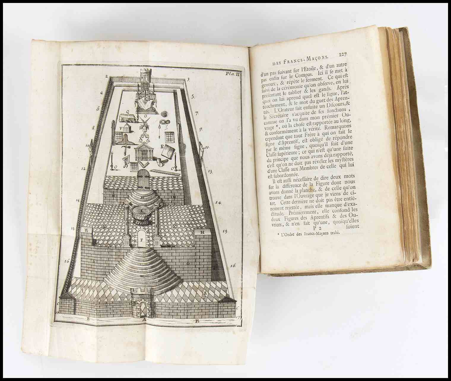 In 8 (cm 17,5), cartone grigio "carta rustica" coevo, con titolo al dorso, esemplare pulito e genuino con bordi increspati, non rifilato. Tavola allegorica incisa a fronte del frontespizio a stampa, con vignetta xilografica raffigurante i simboli della muratura, pp. xxviii, 338, (2), con 5 tavole incise, per lo più ripiegate. Prima edizione. Wofstieg 29969: "Seltene original-Ausgabe"; Barbier II, 506; Kloss 1874; Weller Druckorte II, 120.