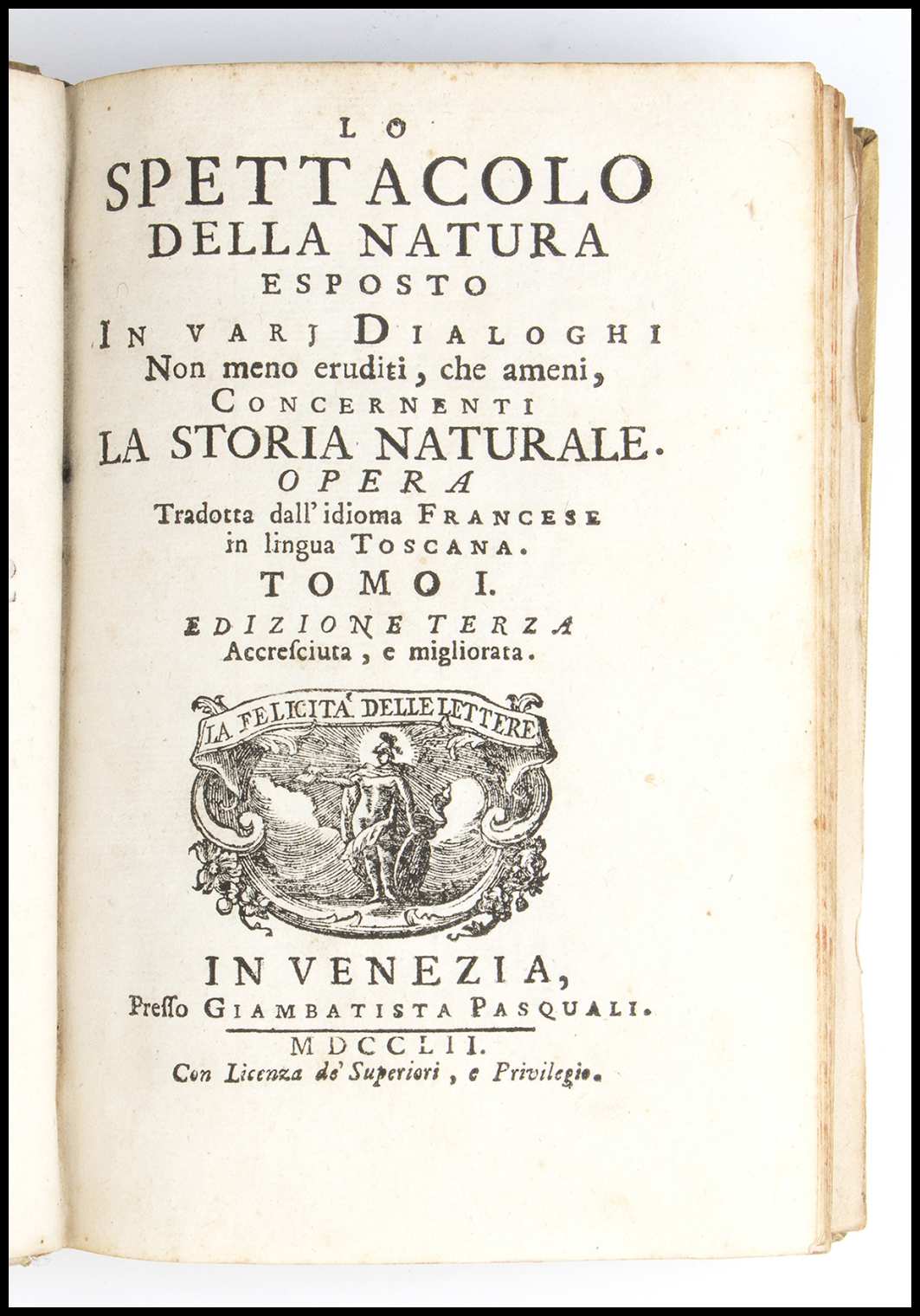Lo spettacolo della natura, In Venezia presso Giambatista Pasquali 1752 In 8....