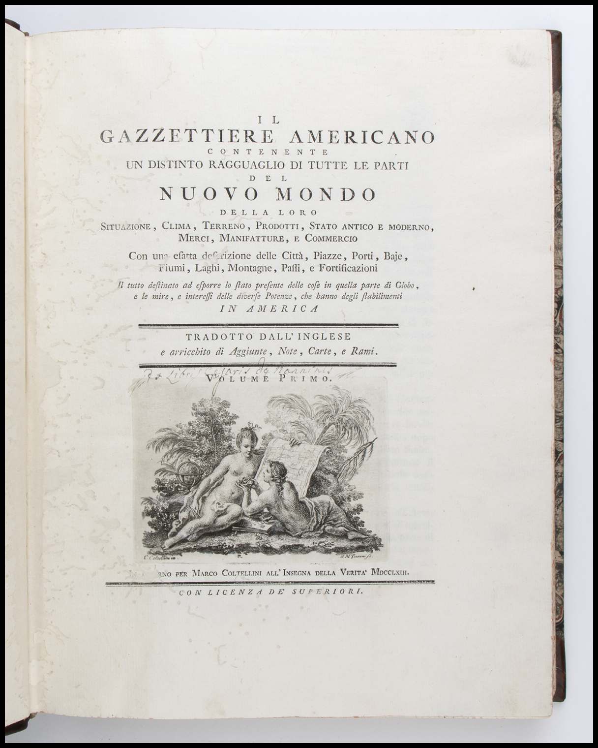 Il Gazzettiere Americano, contenente un distinto ragguaglio di tutte le parti del Nuovo Mondo, della loro situazione, clima, terreno, prodotti, stato antico e moderno, merci, manifatture, e commercio. Con una esatta descrizione delle Città, Piazze, Porti, Baje, Fiumi, Laghi, Montagne, Passi, e Fortificazioni. Livorno 1763