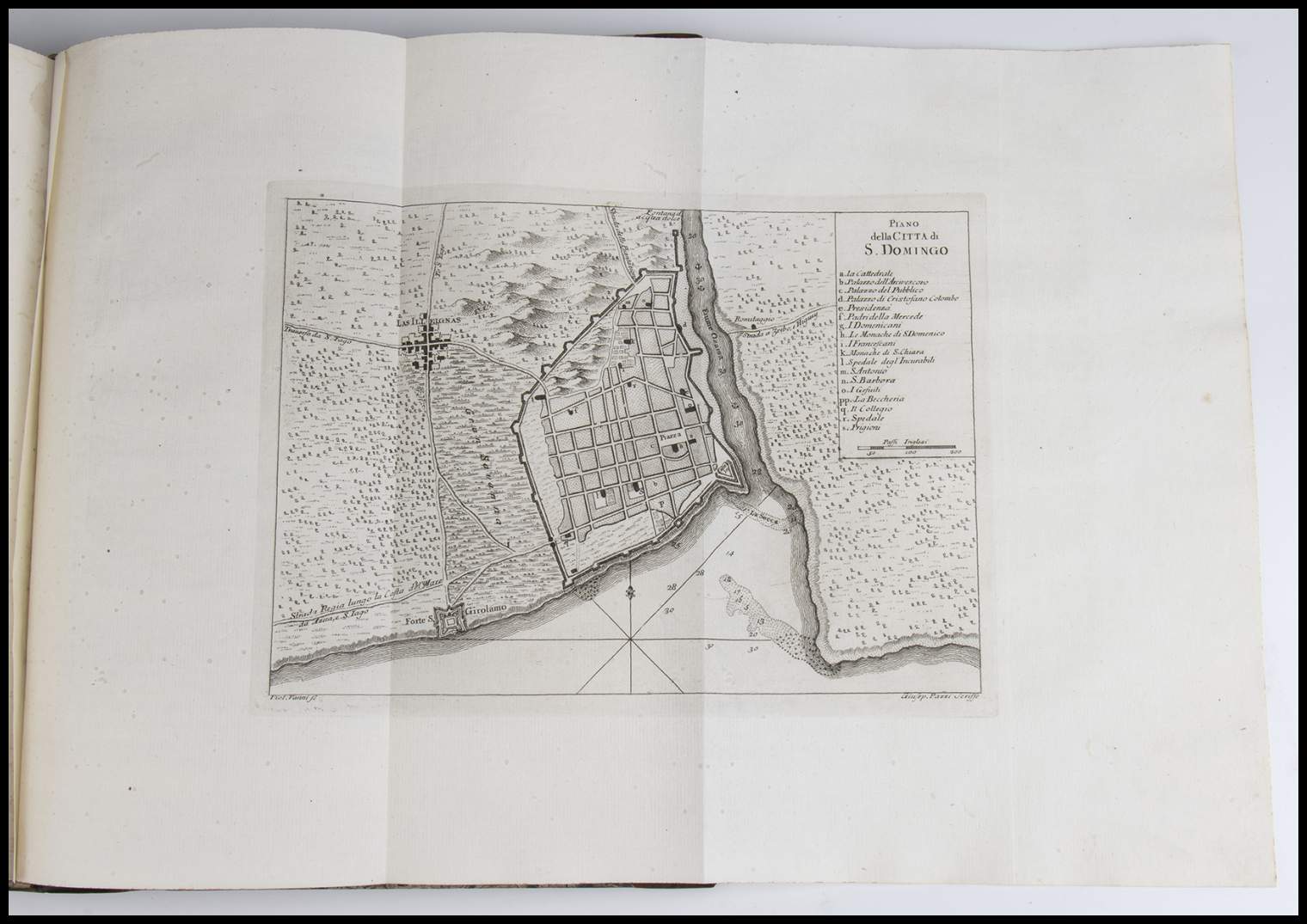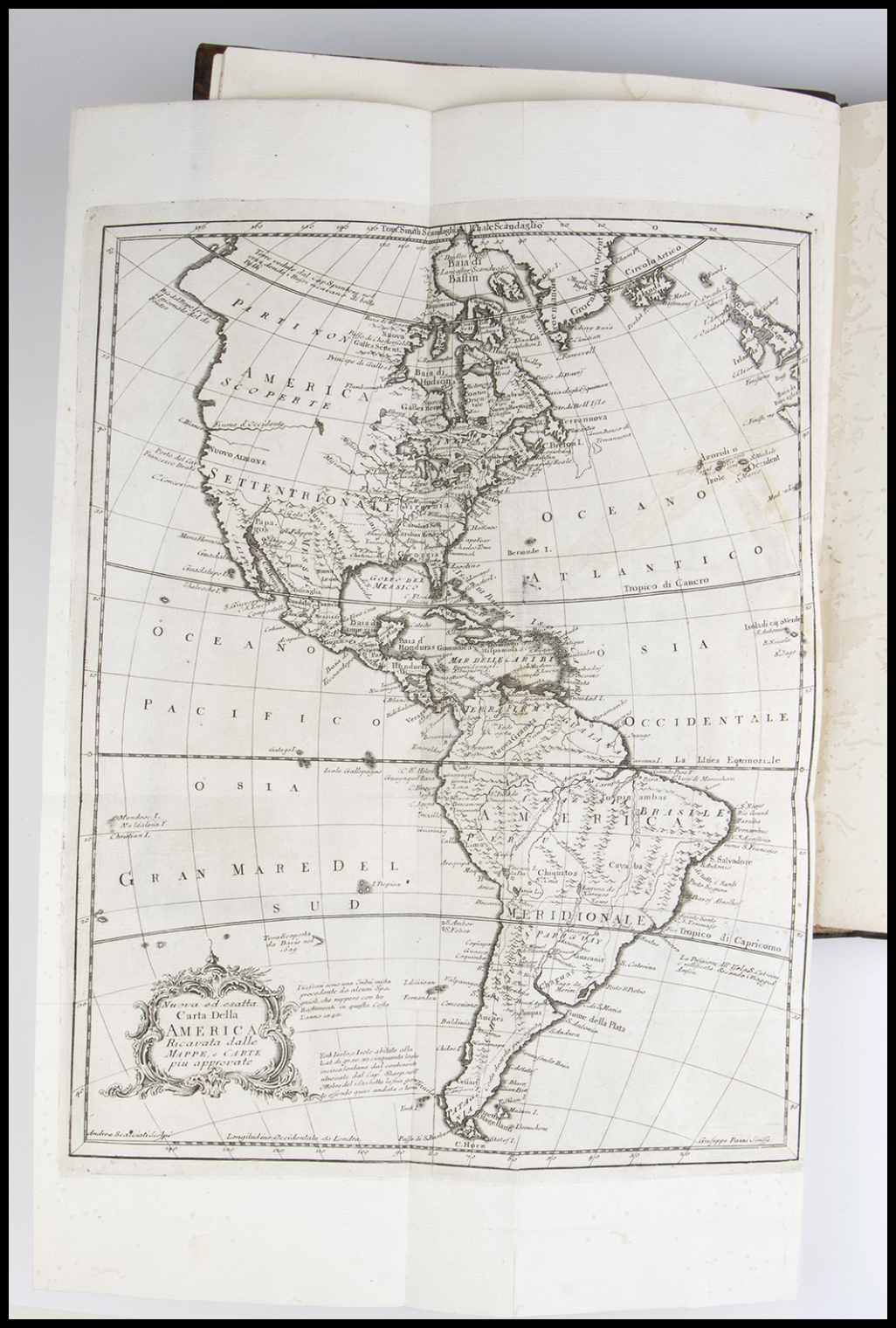 In folio, 3 volumi. Prima edizione italiana dell’American Gazetteer pubblicata a Londra nel 1762, ampliato, con nuove incisioni e mappe. Le tavole raffinate raffigurano vedute, avifauna e fauna, città, persone e industrie, compresa la cura del tabacco e la produzione di zucchero e cotone, del Nuovo Mondo. Le mappe sono in gran parte basate sulla cartografia di Emanuel Bowen.