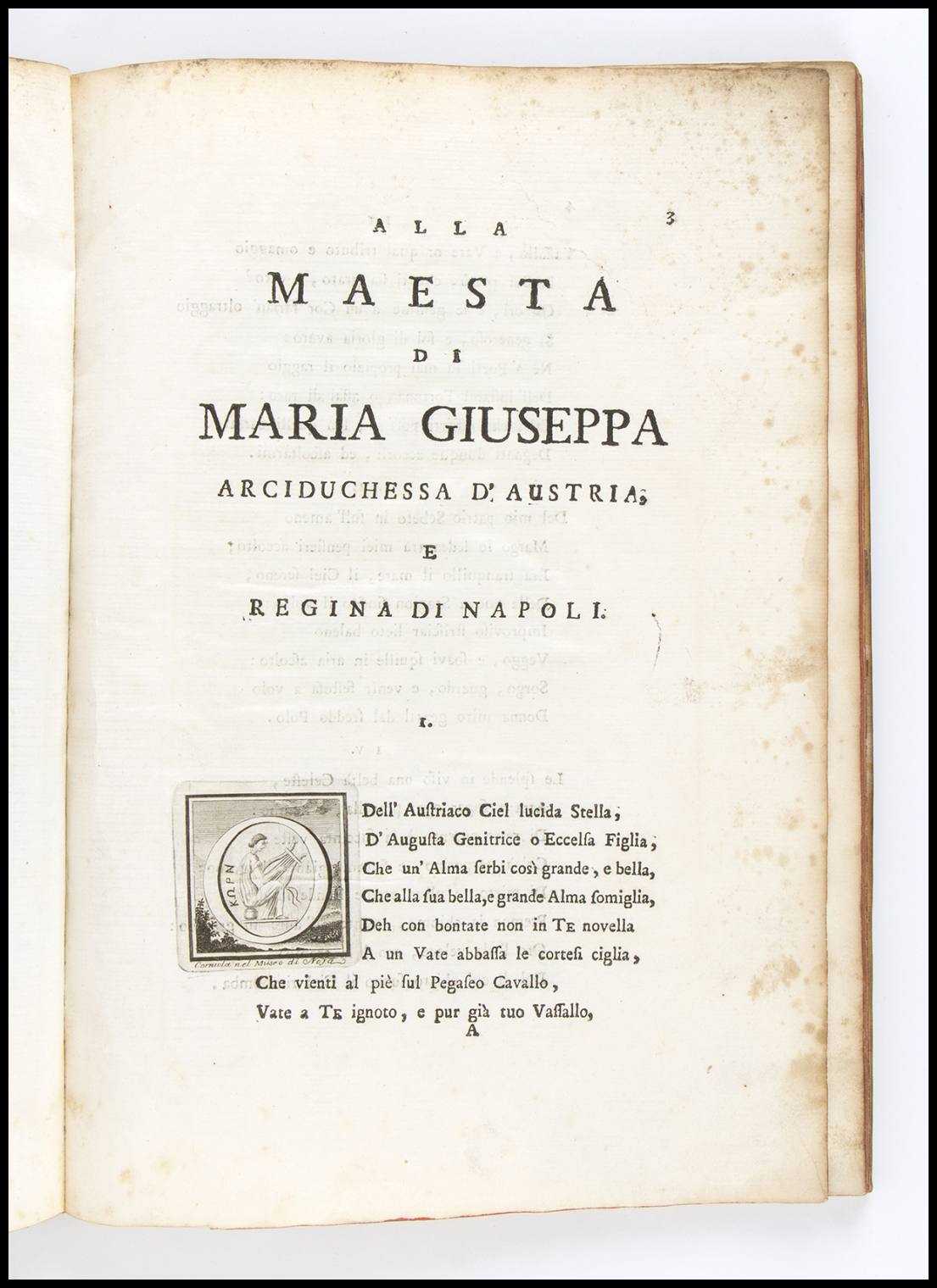 Rara prima edizione di questo omaggio poetico del Di Gennaro a Maria Giuseppa, arciduchessa d'Austria e regina di Napoli. Il testo contiene la descrizione di idillici luoghi della Campania e menzioni sugli autori che li elogiarono. Ottimo esemplare