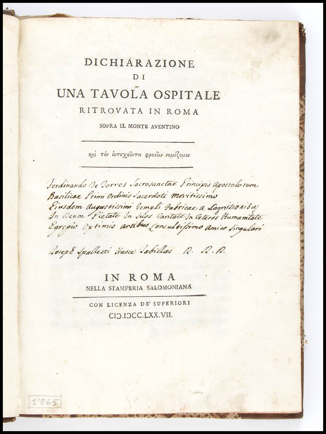 DICHIARAZIONE DI UNA TAVOLA OSPITALE RITROVATA IN ROMA SOPRA IL MONTE AVENTINO. In Roma 1777