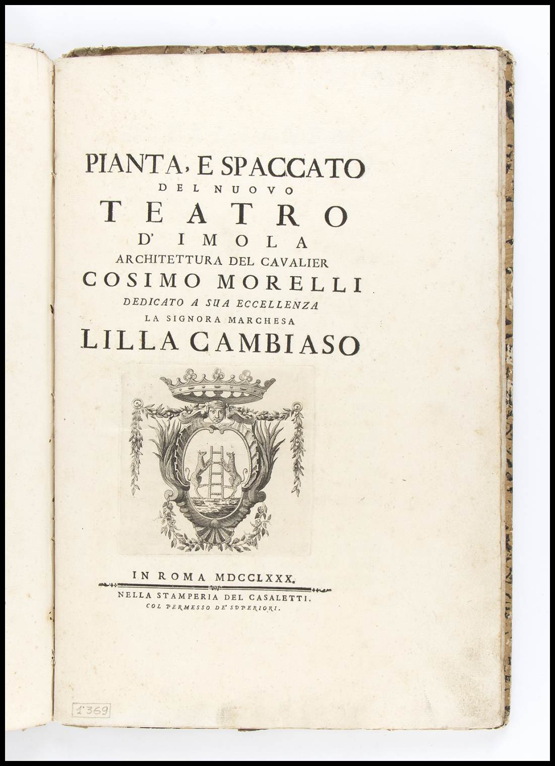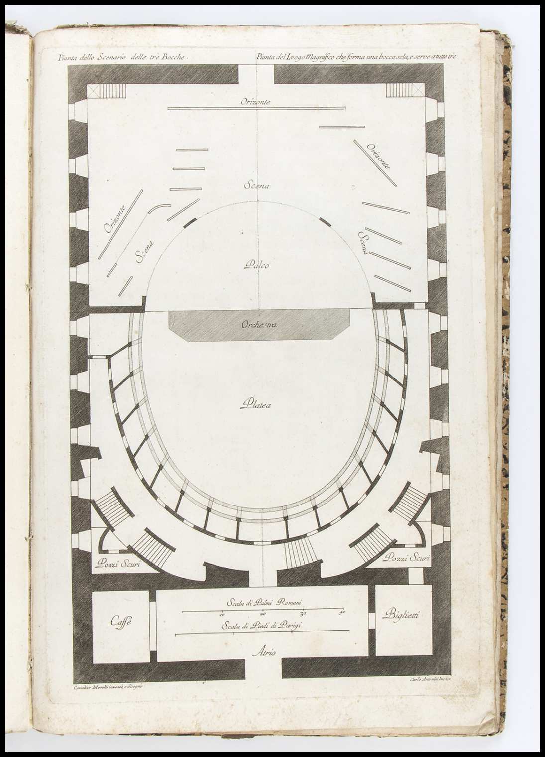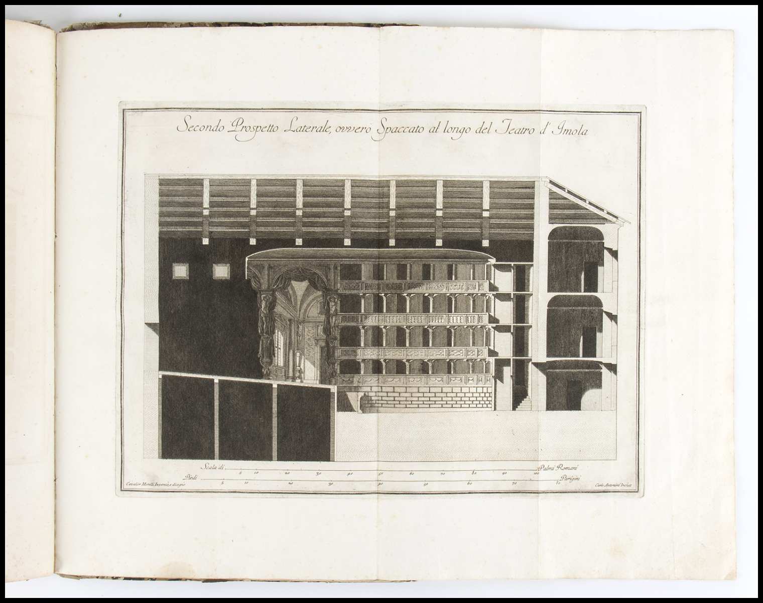 Le 11 tavole finali che raffigurano piante e alzati dei principali teatri di Bologna, Venezia, Torino, Napoli, teatro Greco, Imola, Vicenza, Milano, Roma, Genova, Fano, sono montate a formare un'unica lunga tavola ripiegata più volte; al frontespizio grande stemma calcografico; nel testo anche tre grandi rami che raffigurano il Foro di Nerva, l'ingresso del teatro di Pompeo, Rovine del teatro Marcello e una tavola a piena pagina sul "Modo di ridurre il teatro di Bologna alla forma d'Imola.