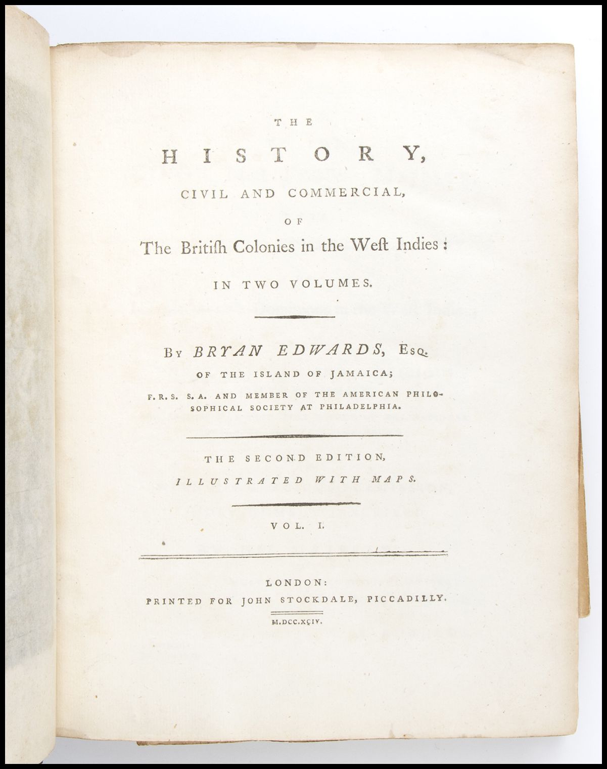In 4. Seconda edizione in due volumi, il terzo volume riguardante Santo Domingo venne pubblicato diversi anni dopo nel 1801. "Un classico della letteratura caraibica britannica e probabilmente l'opera più famosa del settore. Per oltre un secolo, e ancora per molti aspetti il miglior libro sull'argomento fino alla fine del XVIII secolo" (Ragatz: British Caribbean History , pagina 165). Edwards era un ricco piantatore, commerciante e banchiere caraibico di successo, in questo lavoro quel sostiene il libero scambio con gli Stati Uniti, l'autonomia locale e la continuazione attraverso regolamentazione della schiavitù. Un'opera preziosa per ritrarre le condizioni nel periodo compreso tra la conclusione della Rivoluzione americana e l'arresto del traffico di schiavi.