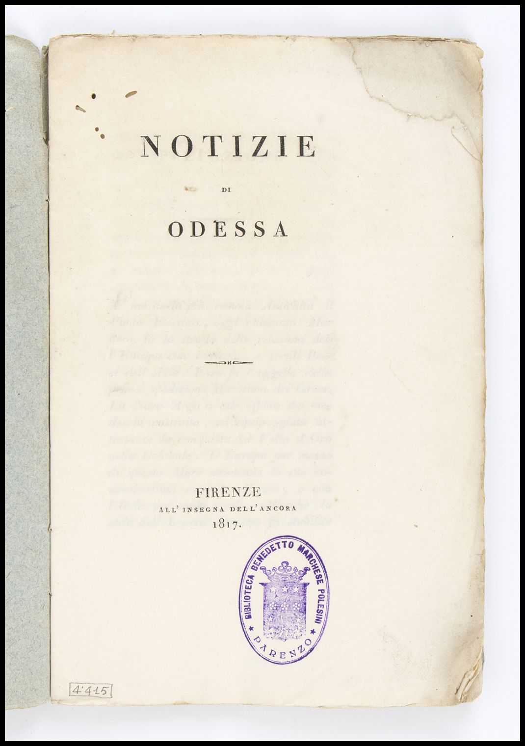 NOTIZIE DI ODESSA. Firenze 1817 In 4 35 pp., incisione fuori testo ripiegata...