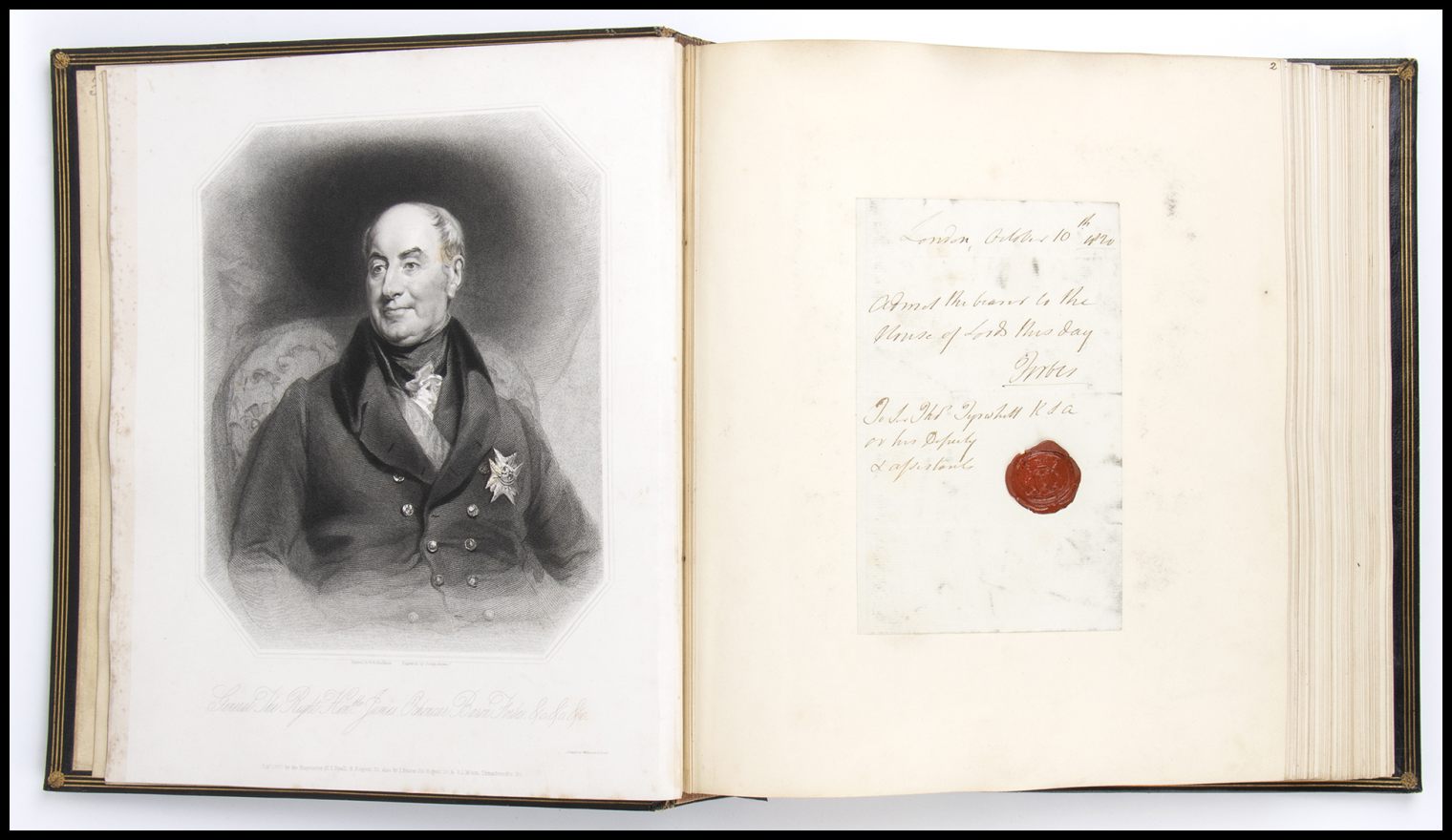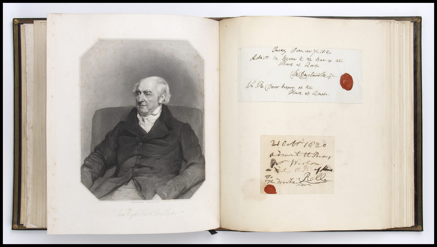 c.280 note autorizzate di ammissione alla Camera dei Lord tra agosto e novembre 1820, indirizzate al portiere e firmate da colleghi e vescovi (inclusi Lords Grey, Holland, Aberdeen, Grenville, Wellesley, Melbourne, Melville, Sidmouth e Wellington) , una lettera firmata da Giorgio IV che ordinava ai Commissioners for Auditing the Public Accounts di assolvere il visconte Castlereagh, Segretario di Stato, dal rendere qualsiasi resoconto della spesa di 7.500, che era stata data a Thomas Coutts & Co. per saldare "i conti del diversi agenti autorizzati nominati per esaminare le inchieste relative a Sua Maestà la Regina. Più di 200 stampe contemporanee Il processo alla regina Carolina alla Camera dei Lord tra agosto e novembre 1820 fu uno dei grandi scandali dell'epoca. tentativo di stabilire il suo adulterio e ottenere il divorzio fallì e, per la gioia del pubblico, fu assolta.Il documento nella presente raccolta, che prova l'uso del Re dei suoi servizi segreti per preparare il caso, per un importo di 7.500, porta vivido testimone della determinazione che provò, nel primo anno del suo regno, a liberarsi del suo legame ufficiale con una donna che aveva a lungo disprezzato e rifiutato. Il suo desiderio fu, guarda caso, esaudito l'anno successivo dopo che le fu fisicamente impedito di assistere alla sua incoronazione, si ammalò e morì.