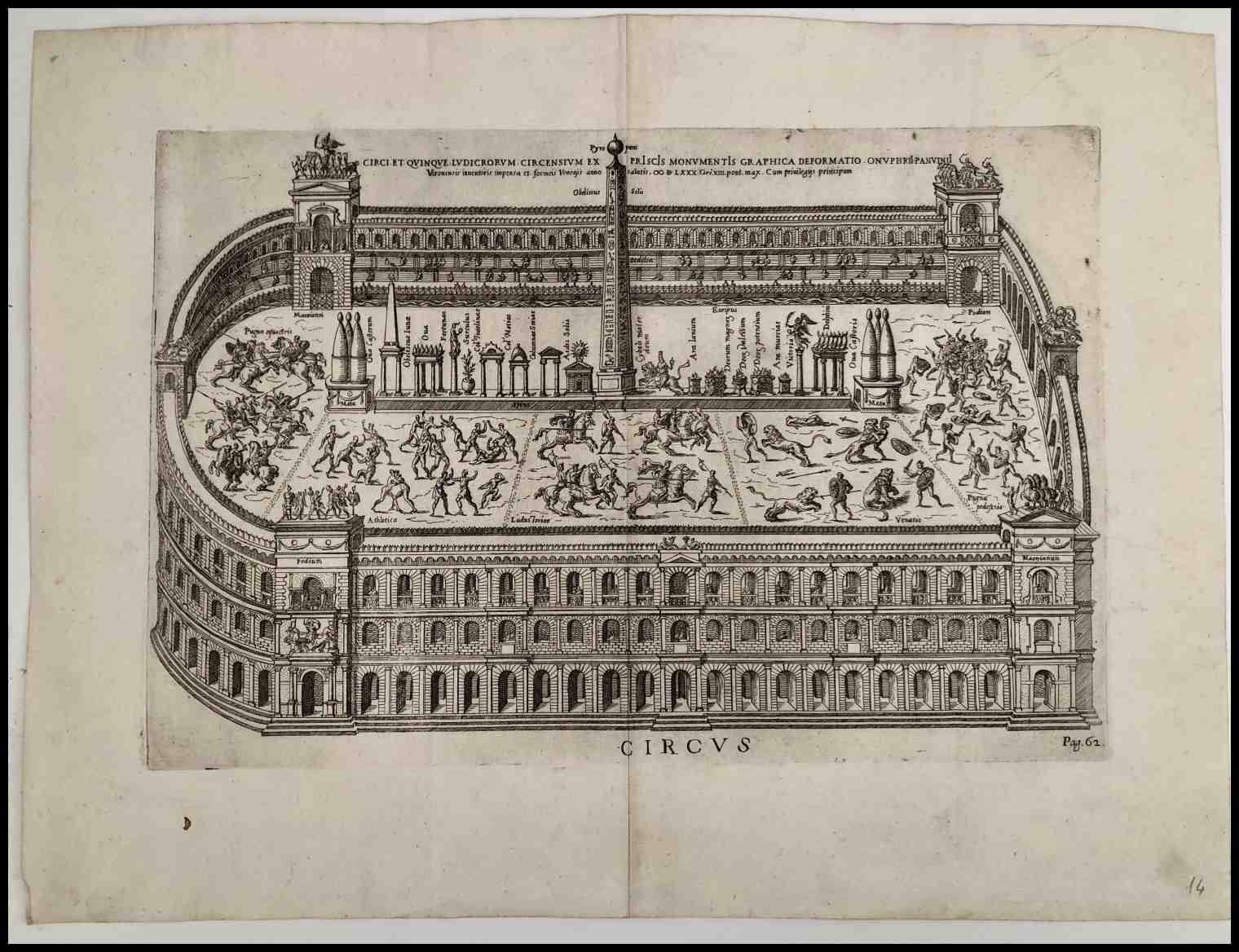 Lotto di 5 tavole raffiguranti circhi di Anticha Roma