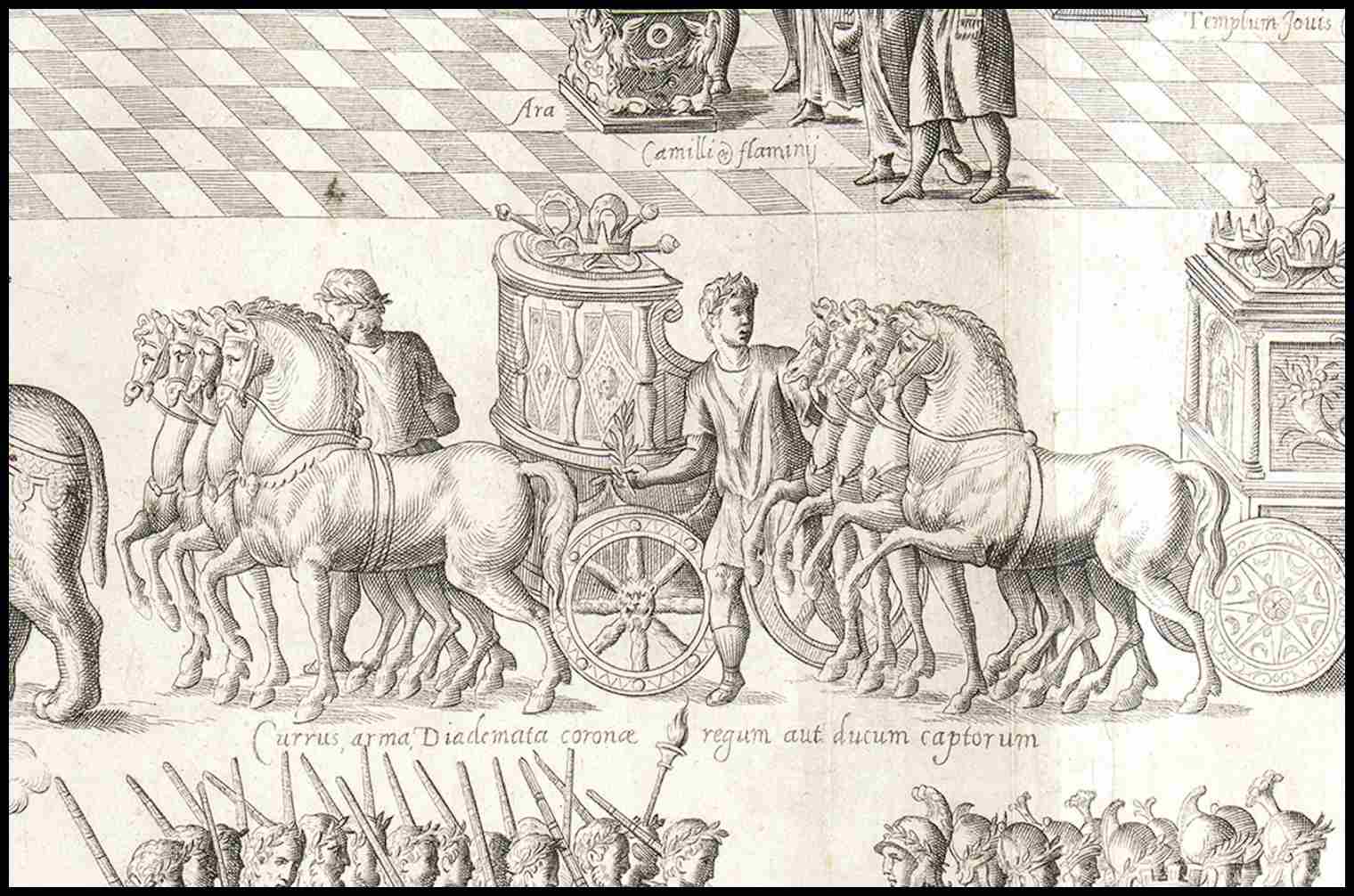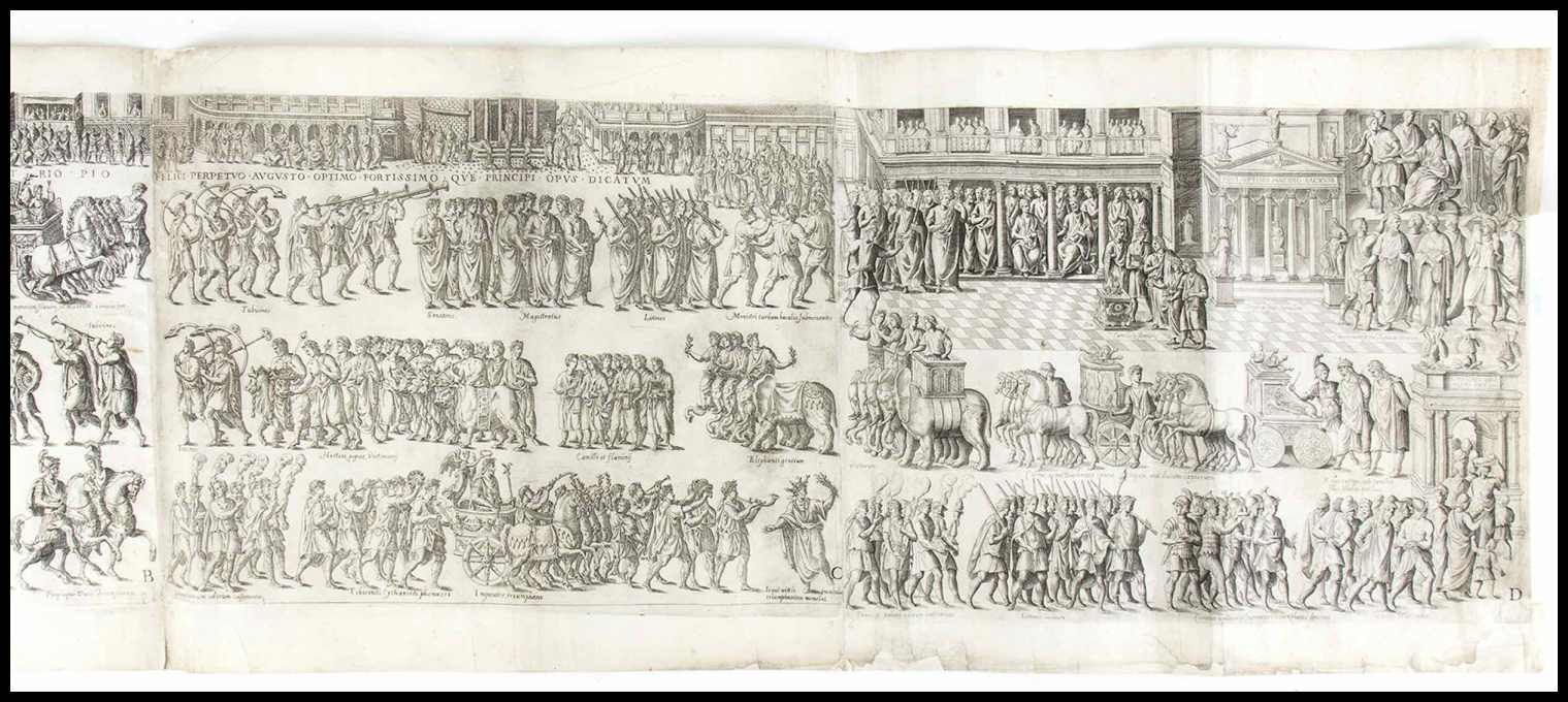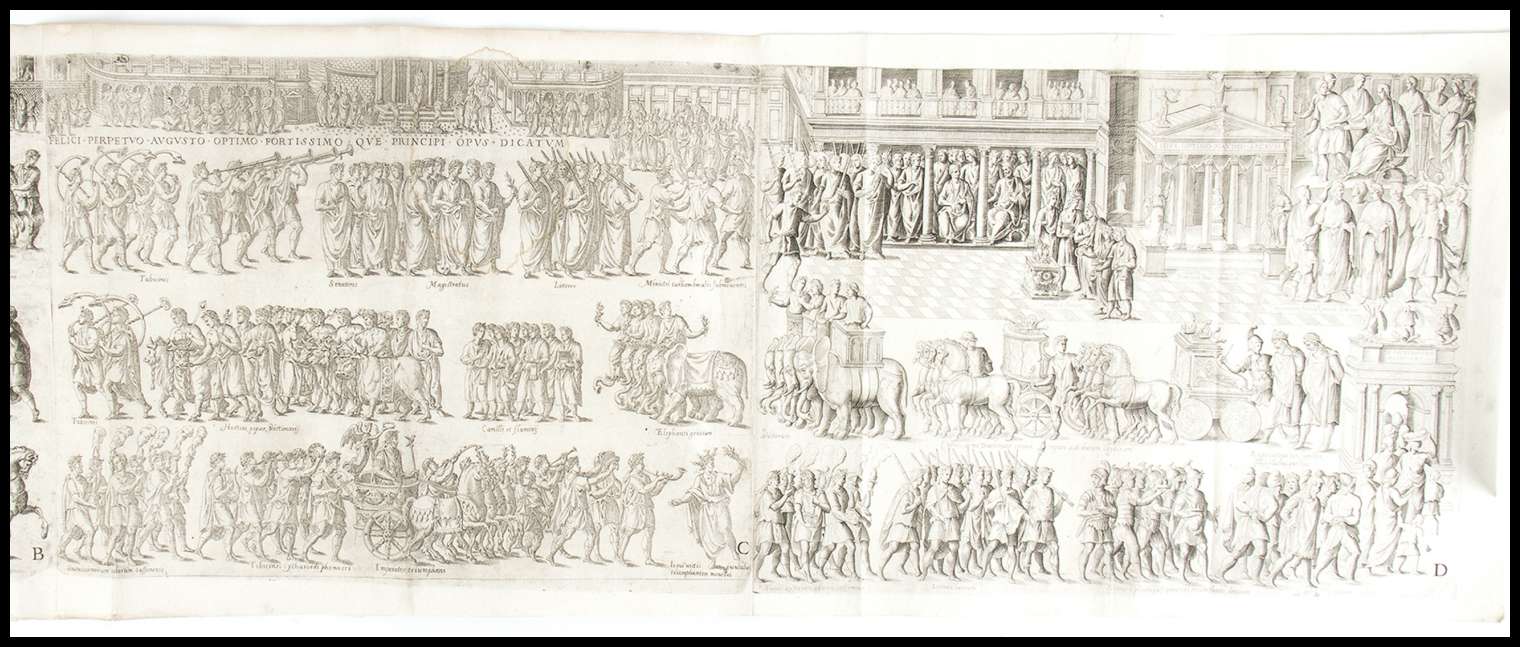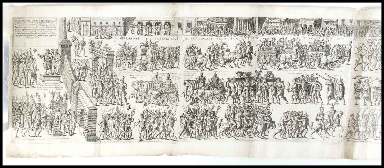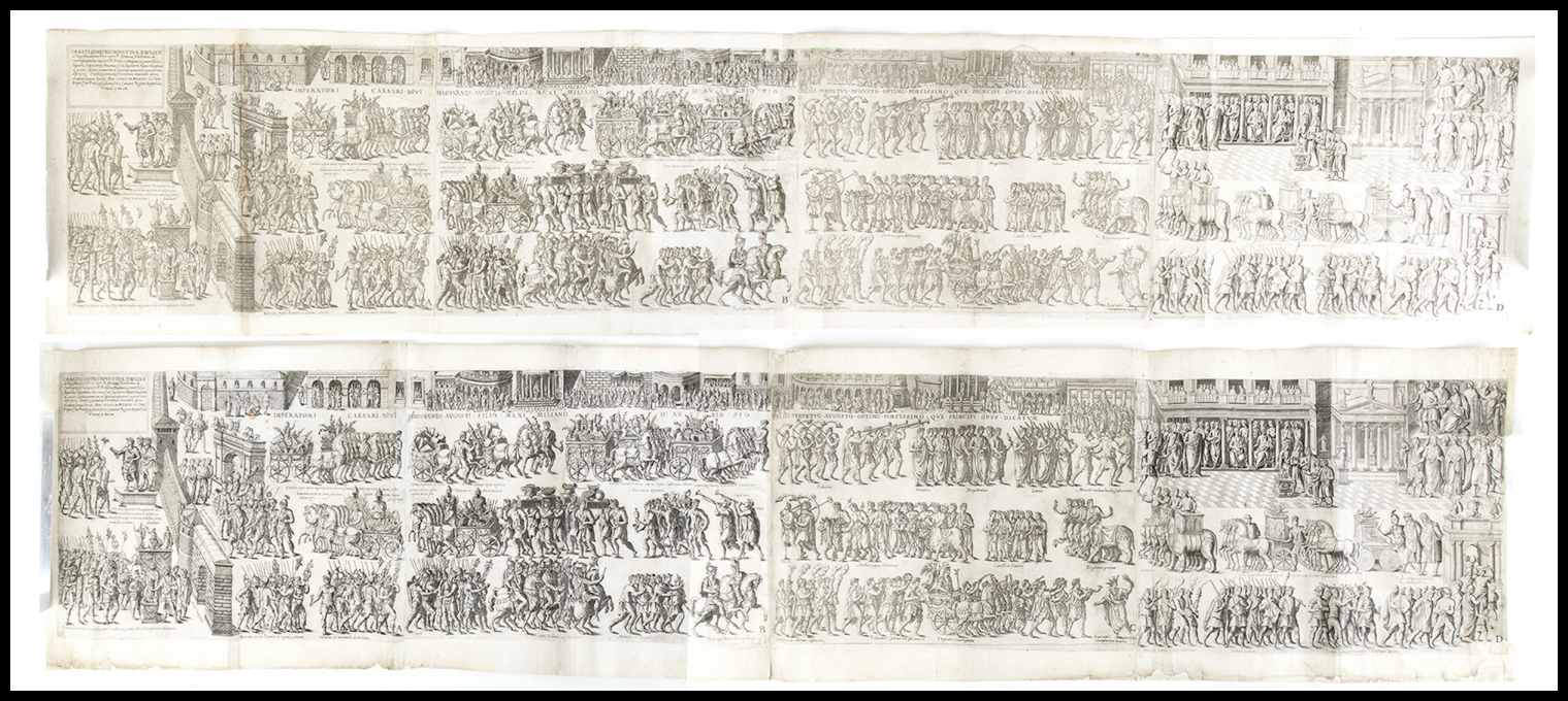 Lotto di due tavole raffiguranti trionfo romano con soldati. Parte di Speculum Romanae Magnificentiae.
