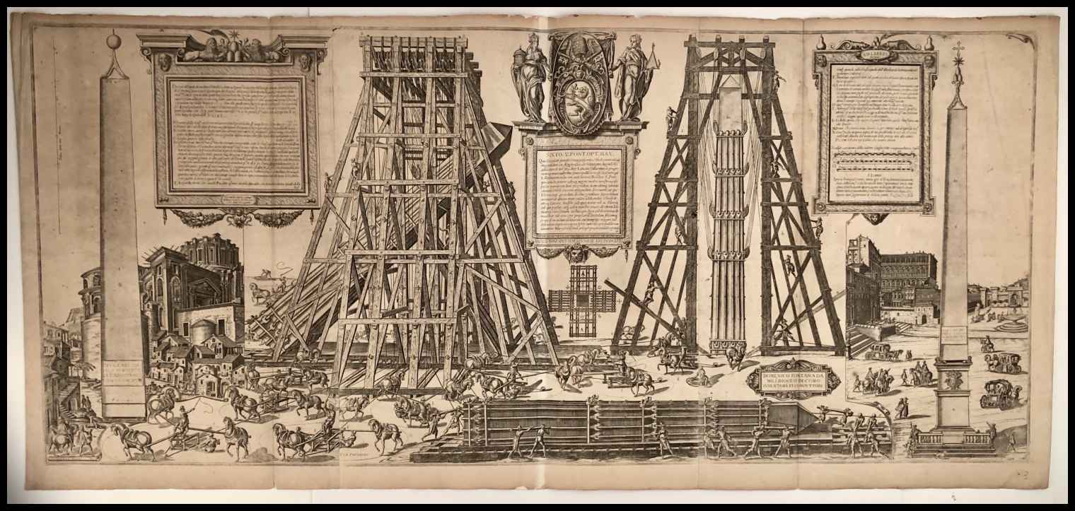 Grande stampa raffigurante Lo spostamento dell'obelisco di San Pietro. Bibliografia: M. Bury, The Print in Italy 1550-1620, London 2001, p.102, n.64;
