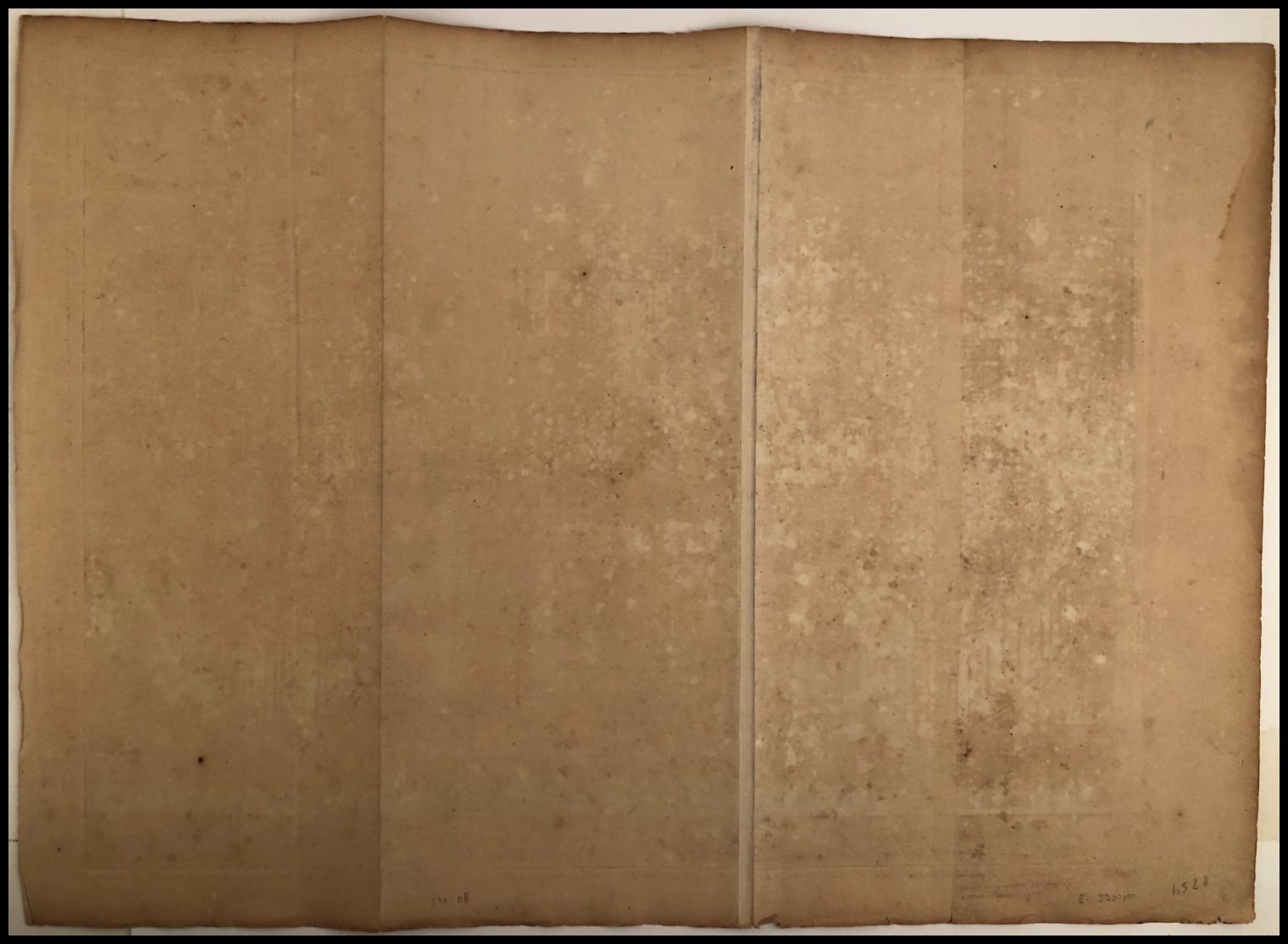 Stampata su tre fogli uniti di carta vergellata. Carta brunita, con segni di fioritura. Tre pieghe verticali, rinforzata al verso. Strappetti e usure lungo i bordi.