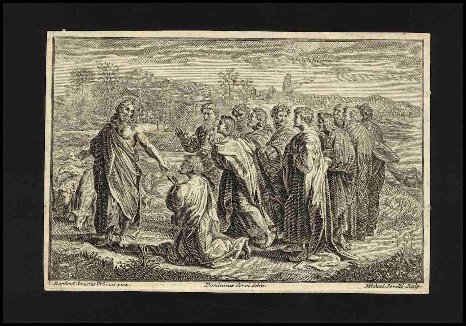 Miguel de Sorello su disegno del Corvi, ed è tratta da uno dei dieci arazzi realizzati per la Cappella Sistina su disegni di Raffaello; Gesù dopo la pesca miracolosa, consegna a Pietro le chiavi del Paradiso e lo esorta ad occuparsi del suo gregge, che simboleggia la Chiesa di DIo.