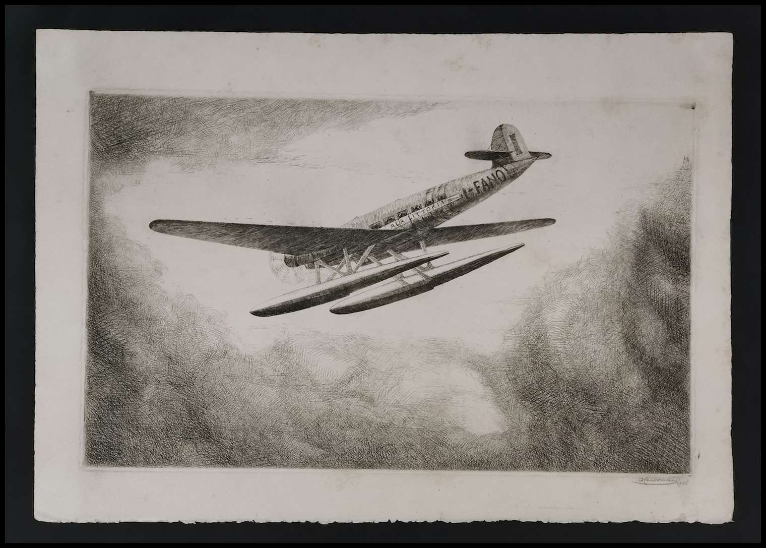 Bella rappresentazione dell’ idrovolante I-FANO dell'Ala Littoria in volo , modello Airone Cant Z.506 Savoia –Marchetti. L'Ala Littoria S.A. fu la prima compagnia aerea di linea italiana, fondata nel 1934 dall’unione di altre compagnie private, ed effettuava servizi di trasporto passeggeri e servizi postali. L’idrovolante entrò in servizio nel 1936 su rotte attorno al mar Mediterraneo, tra cui la linea dell'Impero Roma-Siracusa-Bengasi e la Napoli-Trapani-Tunisi, stabilendo inoltre, tra il 1936 ed il 1938, una serie di record di quota, velocità e distanza, per la sua classe. Antonio Carbonati studiò a Venezia con Ettore Tito e si perfezionò a Roma con Giulio Aristide Sartorio, con cui collaborò nel Fregio del Parlamento a Palazzo Montecitorio. Si dedicò moltissimo alla tecnica dell'acquaforte e dal 1917 realizzò numerose vedute di città italiane, presenti oggi nelle collezioni comunali. Espose nelle maggiori mostre d’arte del periodo, Quadriennale romana, al Salon d'Automne di Parigi e alla Biennale di Venezia, che nel 1942 gli dedicò una personale con oltre 300 opere.