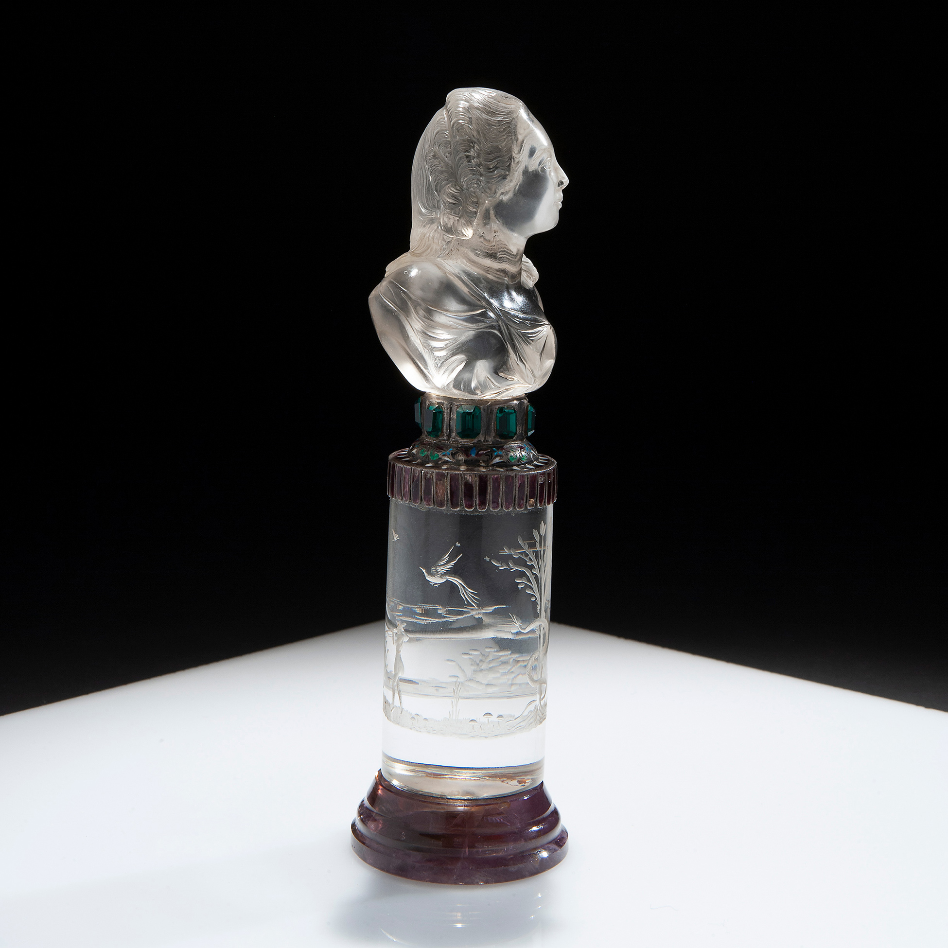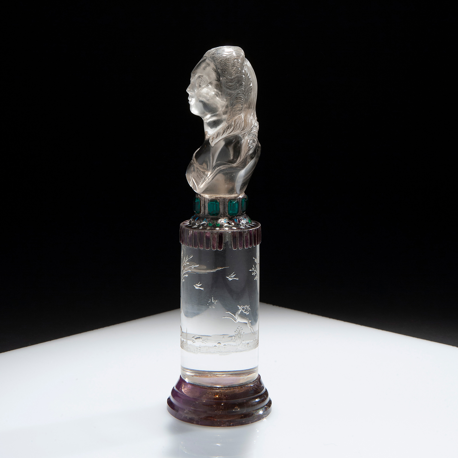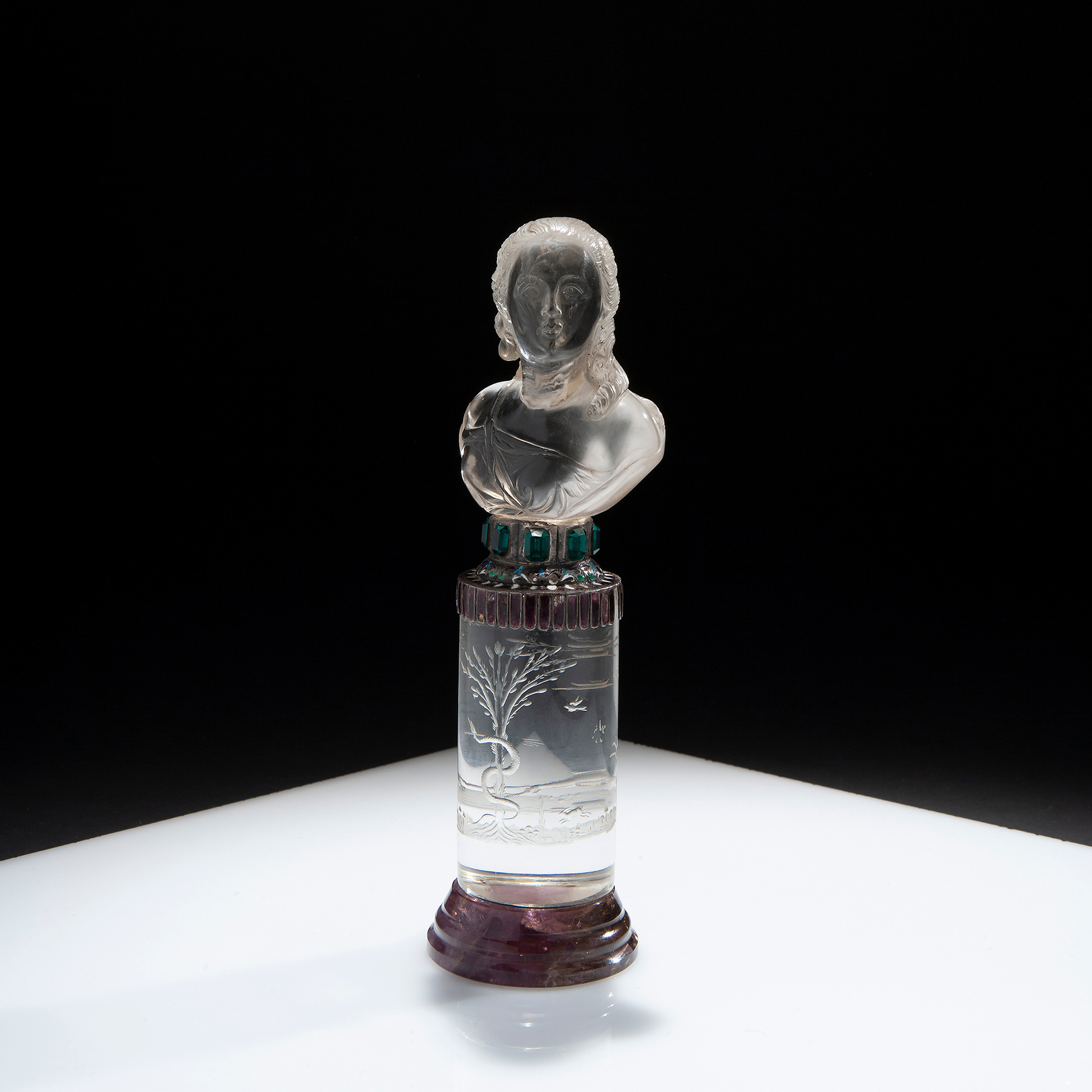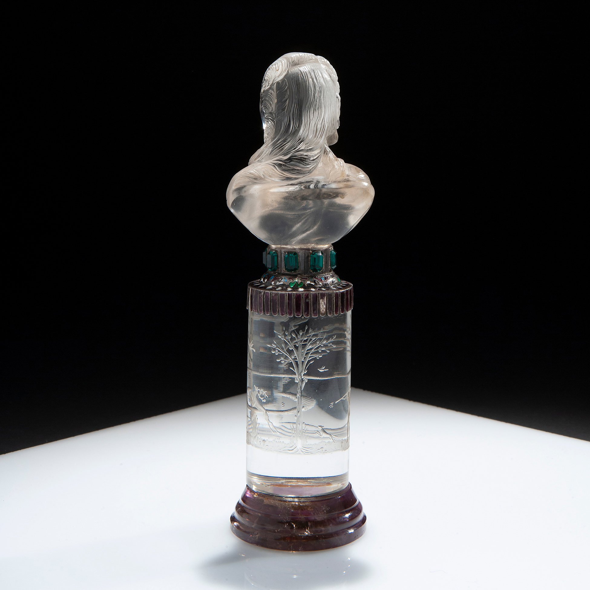 Base in argento smaltato, cristallo di rocca inciso e Blue Jhon. Dimensioni 19x6x5,5 cm.