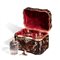 Manifattura napoletana composta da scatola con coperchio, quattro flaconi e piccolo imbuto, oro 18 kti; manufatto da collezione. Dimensioni 11x17.5x13 cm.