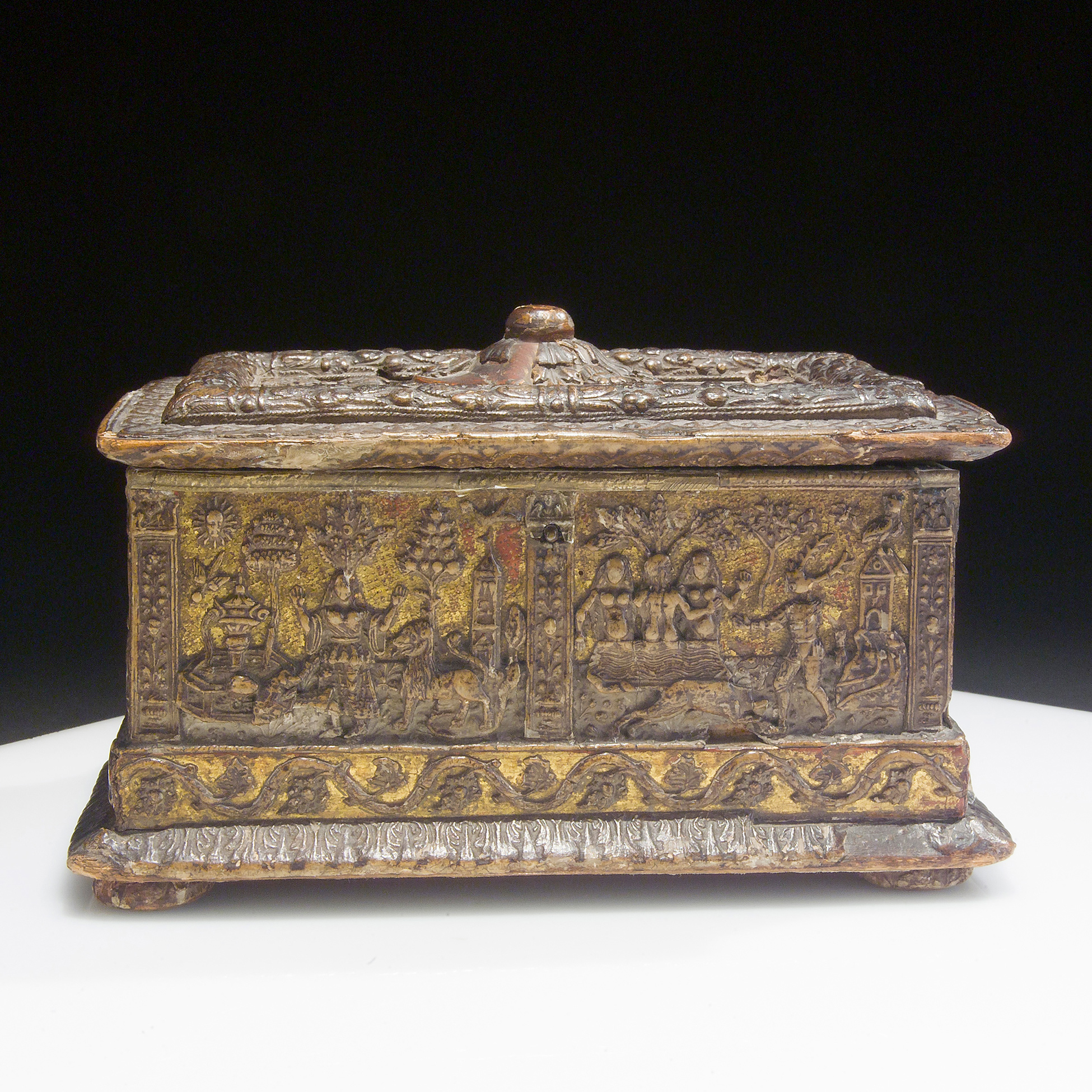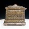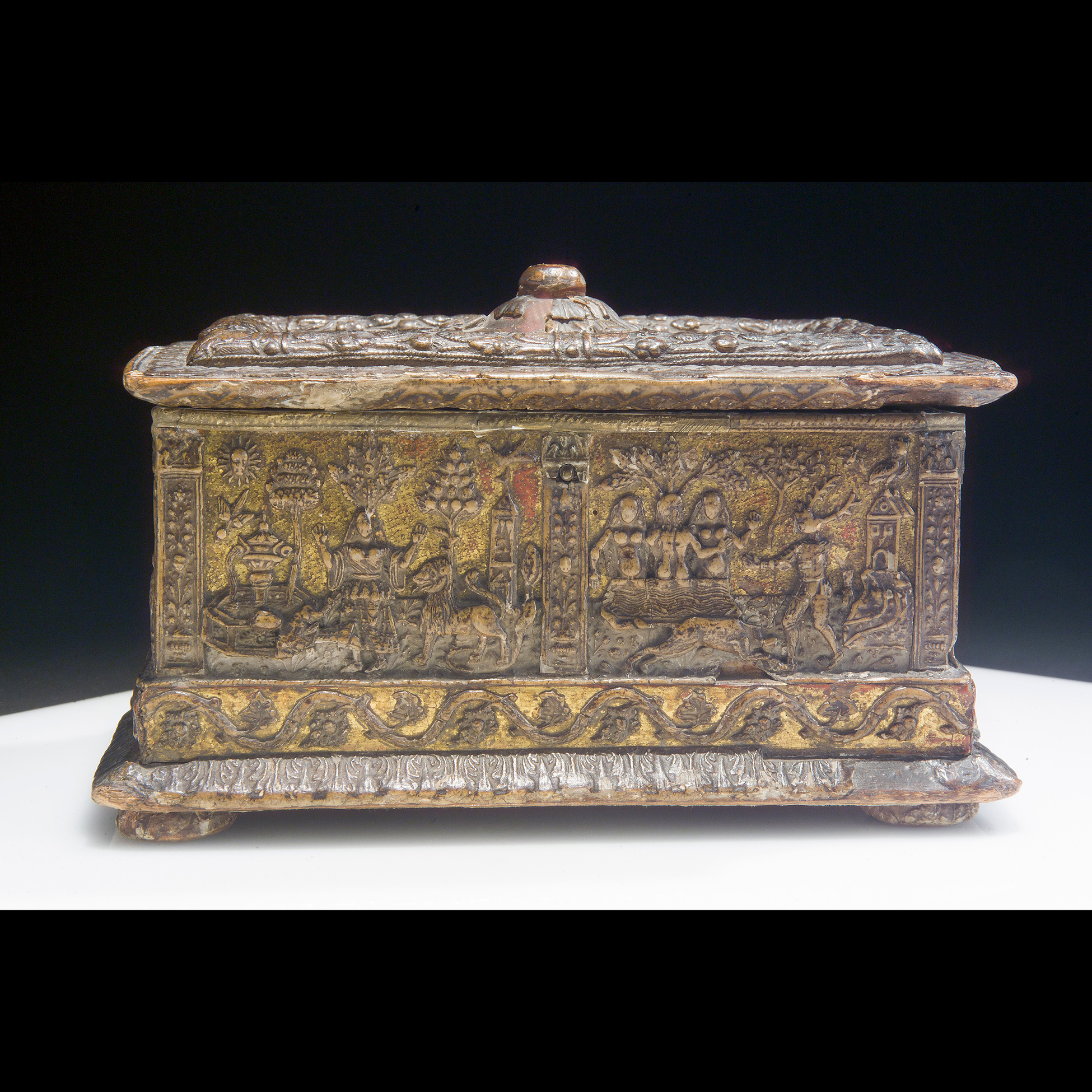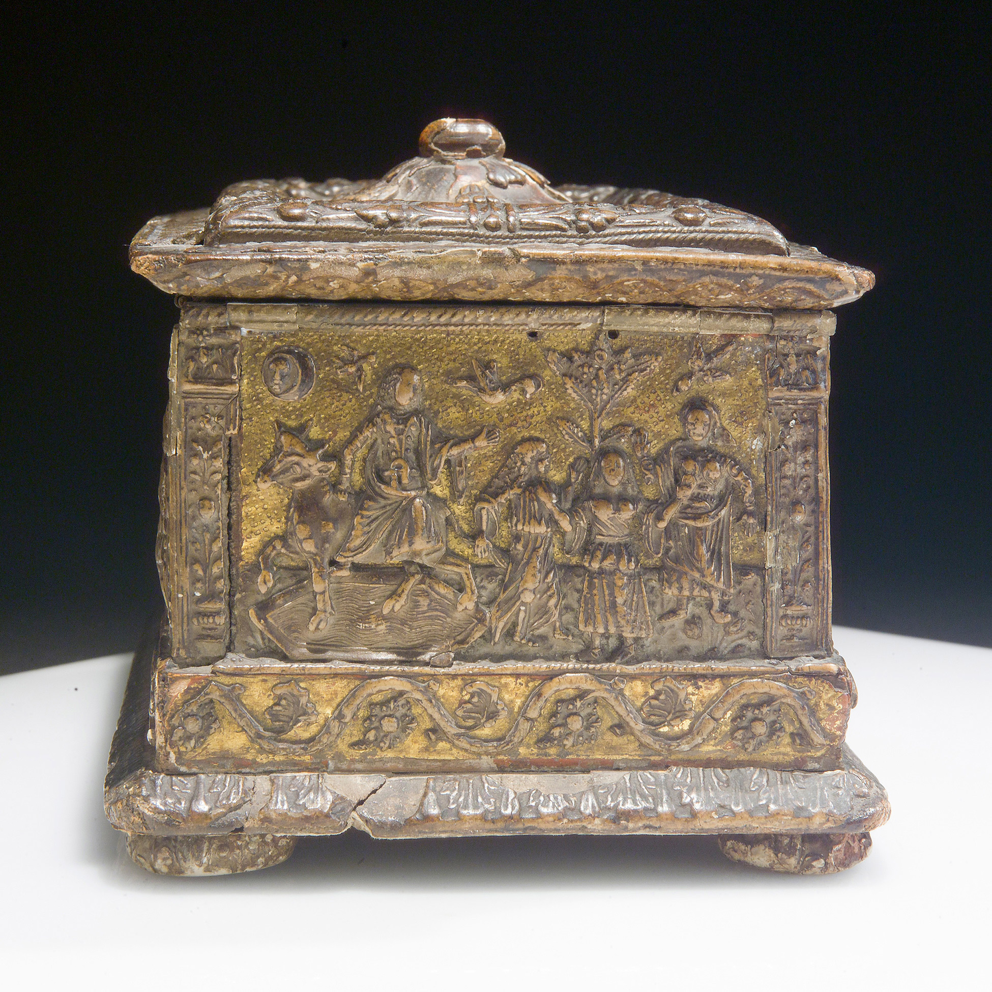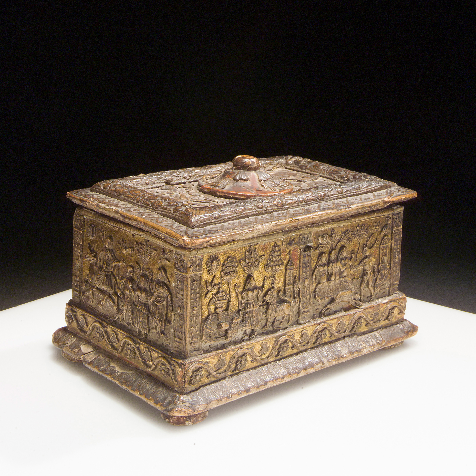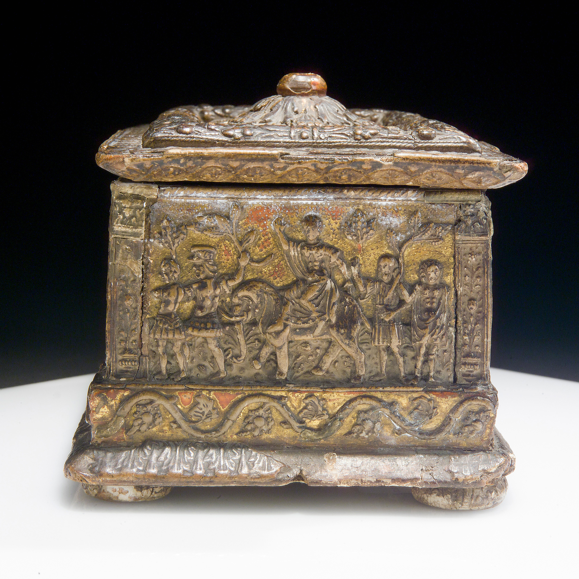 Esemplare riconducibile alla cosiddetta 'Bottega dei temi morali e amorosi', già attiva intorno al 1520, vede raffigurati temi biblici, mitologici e storici. L'interno è decorato con inserti di carta decorata a motivi astratti. Per una bibliografia comparativa si fa riferimento al volume di C. Bertolotto, 'Cofanetti in pastiglia del Rinascimento', edito da Allemandi nel 2020. Presente adesivo sul fondo recante l'iscrizione 'dept of woodwork. On loan from Wallis Harold - no. 8, May 14 1917'. Dimensioni complessive 12.5x20x12.5 cm.