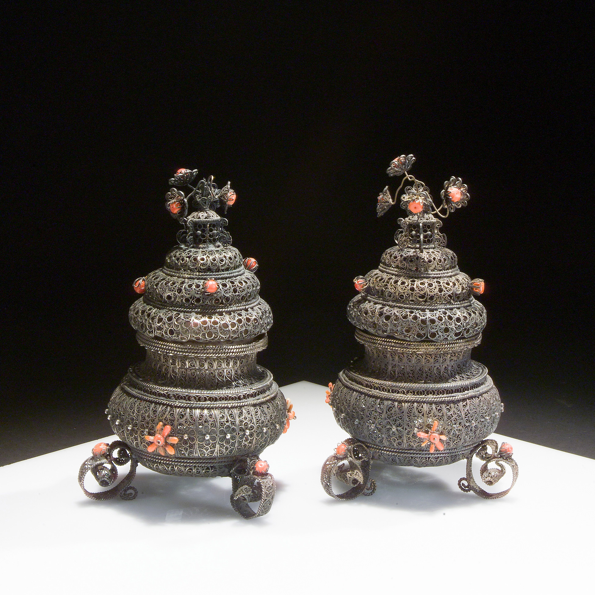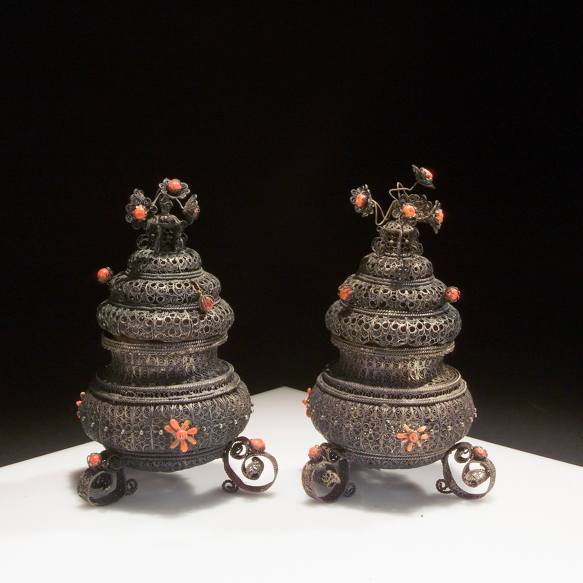 Coppia di spargiessenze in filigrana d'argento e corallo, Trapani XVIII secolo