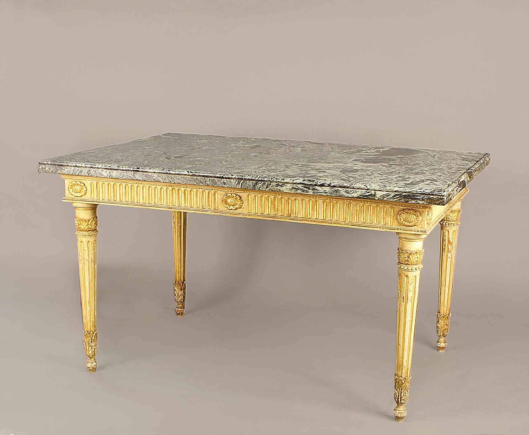 Tavolo stile Luigi XVI in legno dorato, piano rettangolare in marmo verde Alpi poggiante su quattro gambe scanalate, cm. 80x140x100.