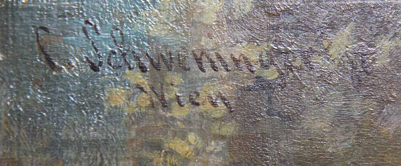 "Lady with a cigarette". Oil on wooden panel. Size 32,2 x 25,6 cm; 45 x 36,5 (framed). Signed upper left: "C.Schweninger jr. Wien”. On the reverse: wax seal “Hisclher & Comp.” of the Viennese art gallery. Provenance: Private Collection, Tallinn