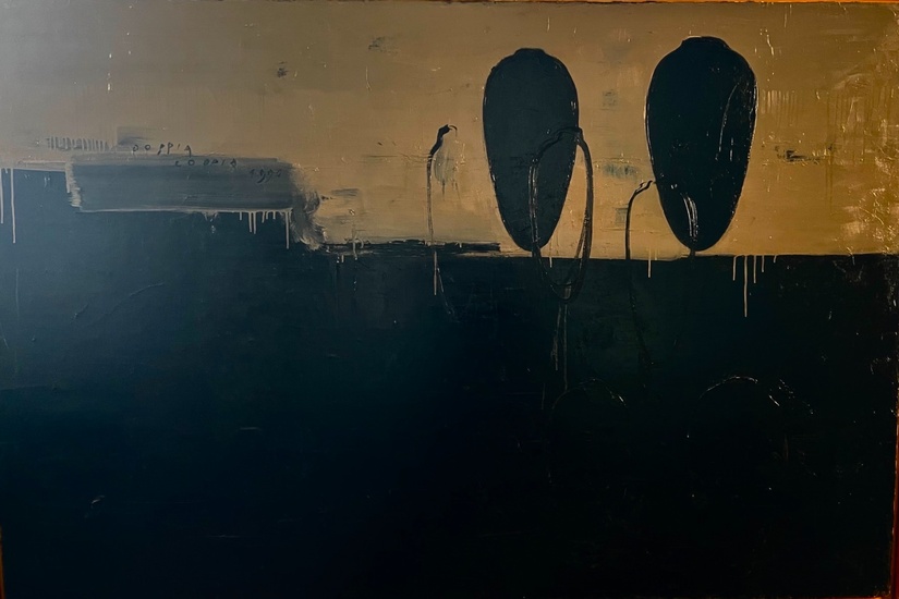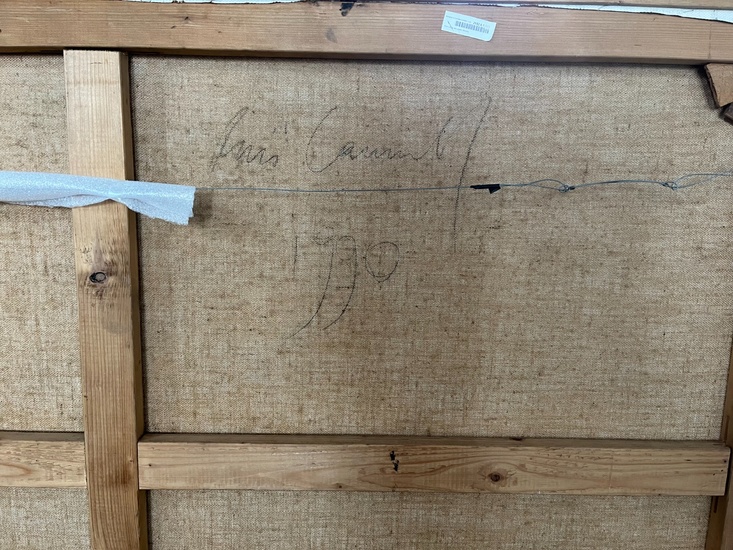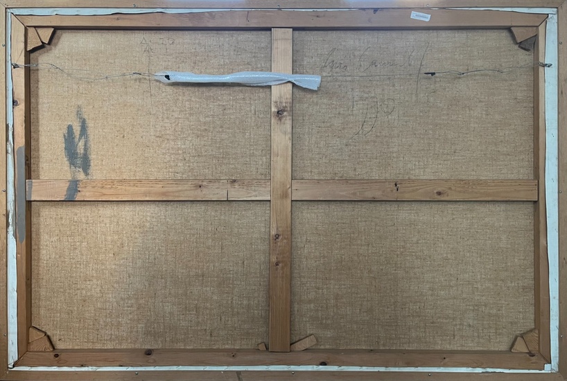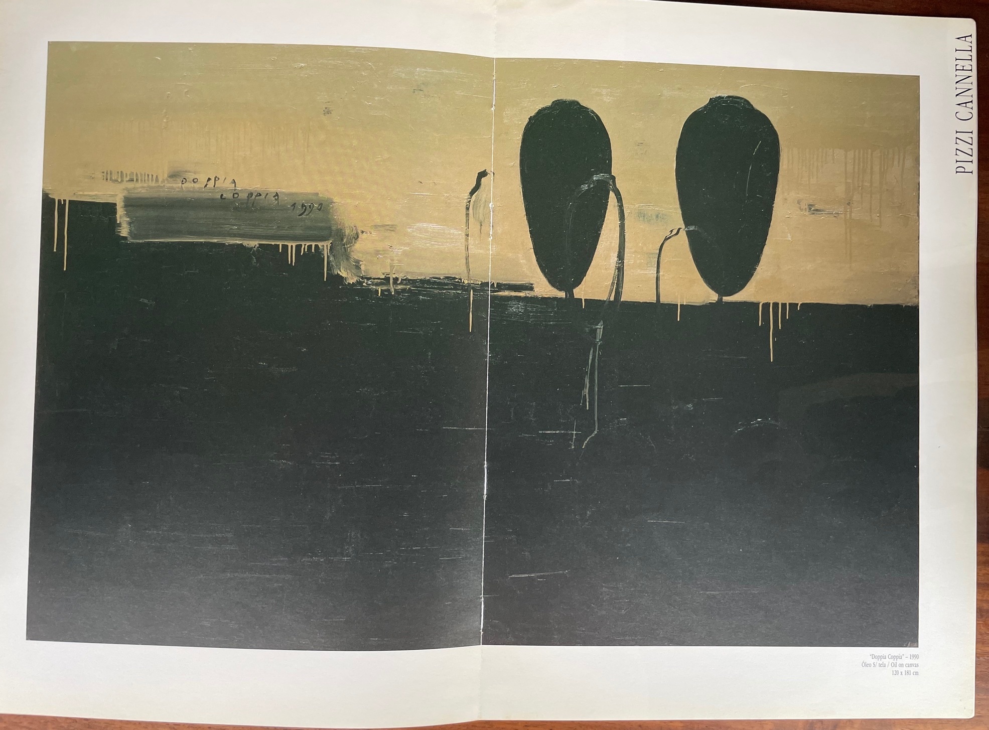 "Doppia Coppia" (Double Couple). Oil on canvas, 1990. Size 120 x 181 cm. Titled and dated on the front, signed and dated on the back. Exhibition: "Nunzio Pizzi Cannella. Trabalhos Recentes", Galleria Fluxus, Porto (Portugal), 8 December 1990 - 15 January 1991. The artwork is accompanied by the certificate of authenticity released by Archivio Pizzi Cannella, Rome (Italy) Provenance: Private Collection, Amsterdam