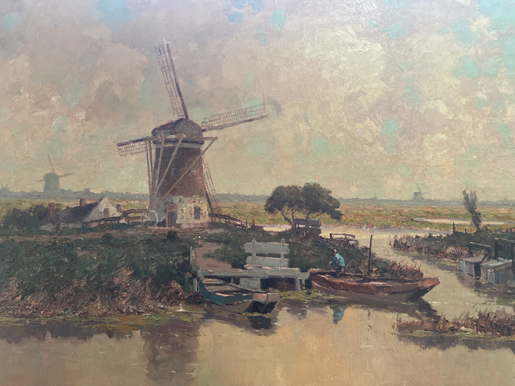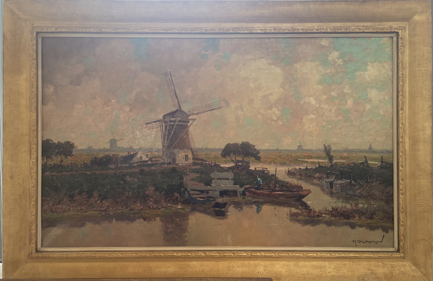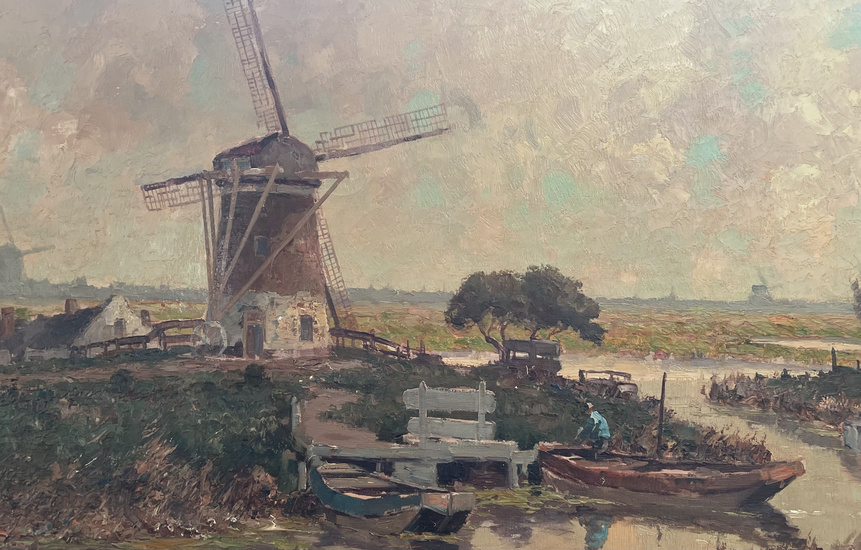 "Polder landscape with windmills". Oil on canvas. Size 60.5 x 100 cm. Signed on the front (bottom right). Provenance: Private Collection, Amsterdam