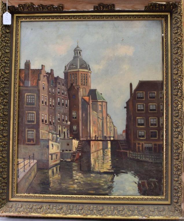Oil on canvas framed painting of a European city scene with canal and bridge. Signed in the lower left corner. Circa 1930's -1950's. Size 30 x 25.5 inches. Provenance: Private Collection, Amsterdam