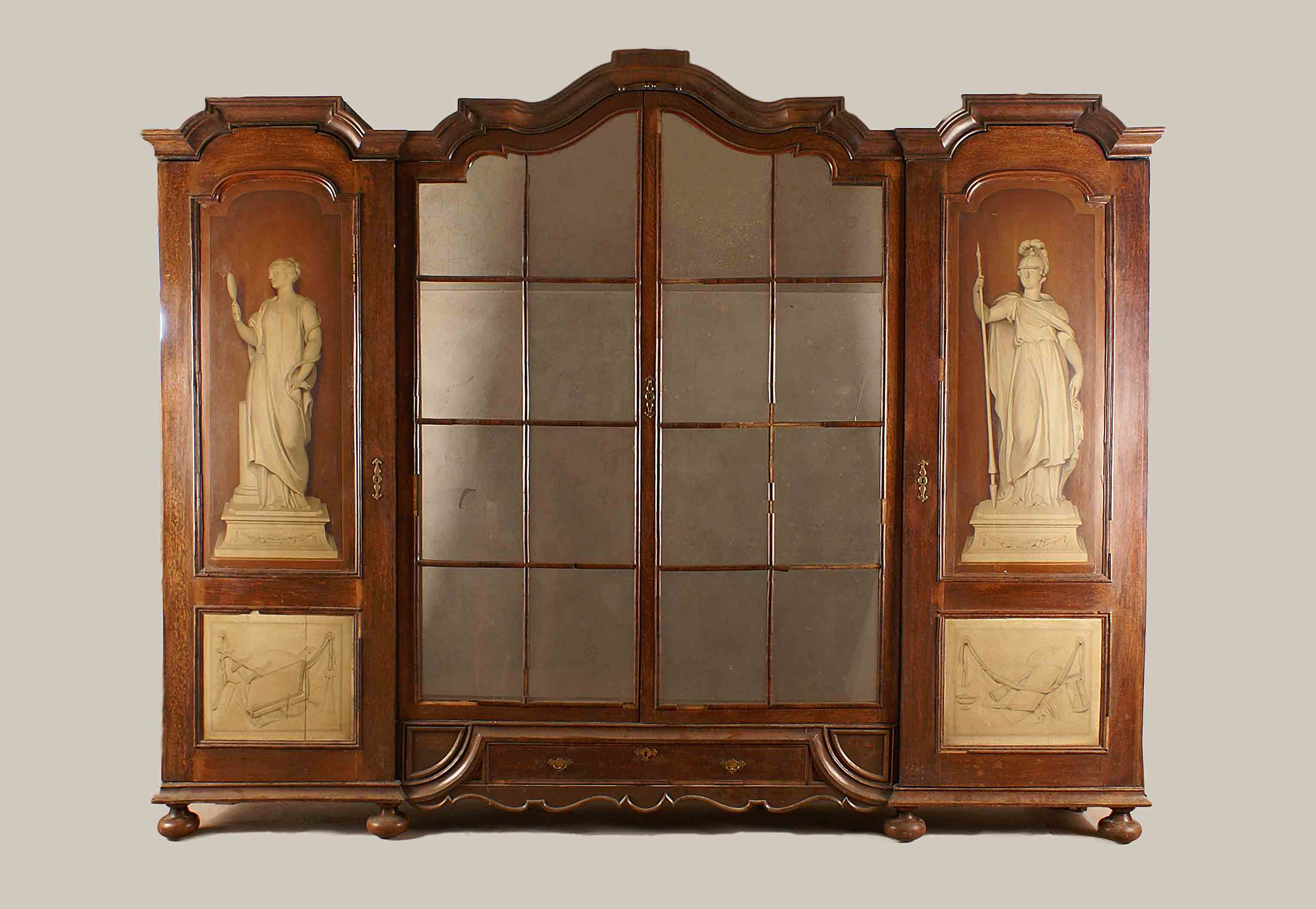 Armadio in rovere a quattro ante di cui due dipinte a grisaille raffiguranti allegorie, firmate e datate 1739 e due a vetri con ripiani interni, Olanda XVIII secolo, cm. 268x334x44, (difetti e mancanze).