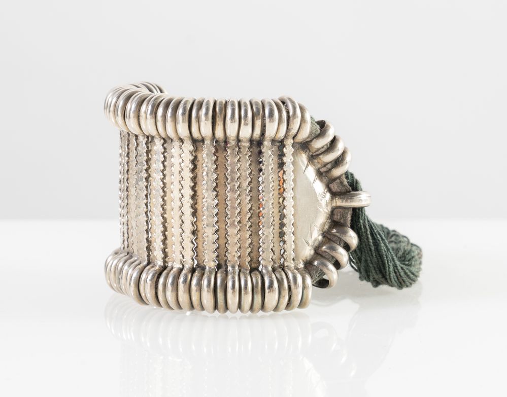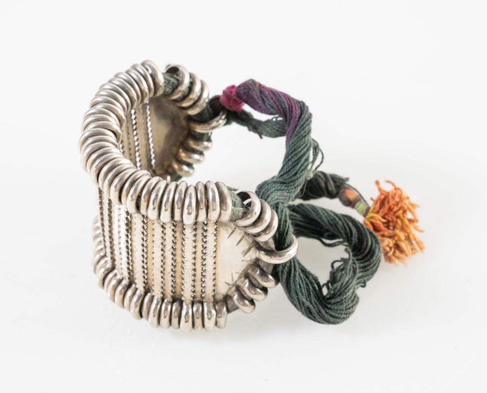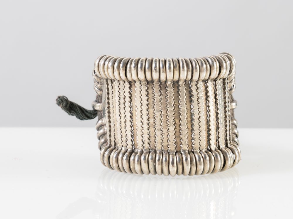 Lavorazione ad anelli e lamine seghettate; completo di cordina di chiusura a matassa di colore verde e rossa.