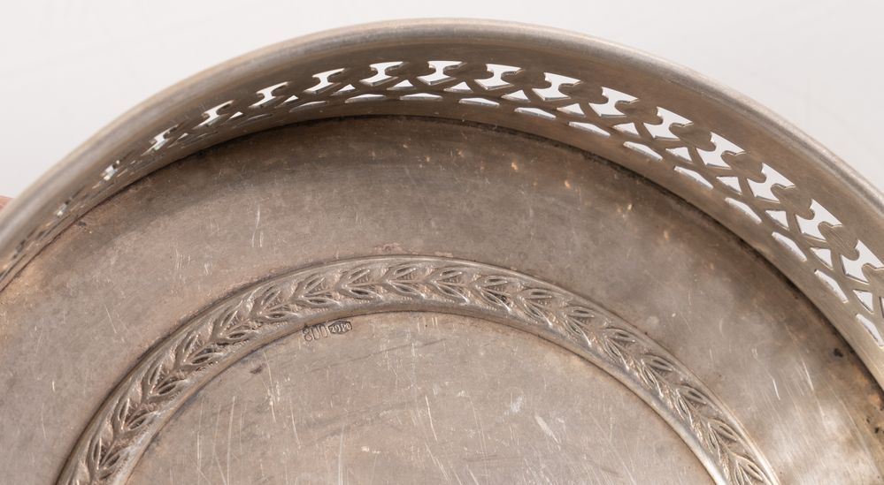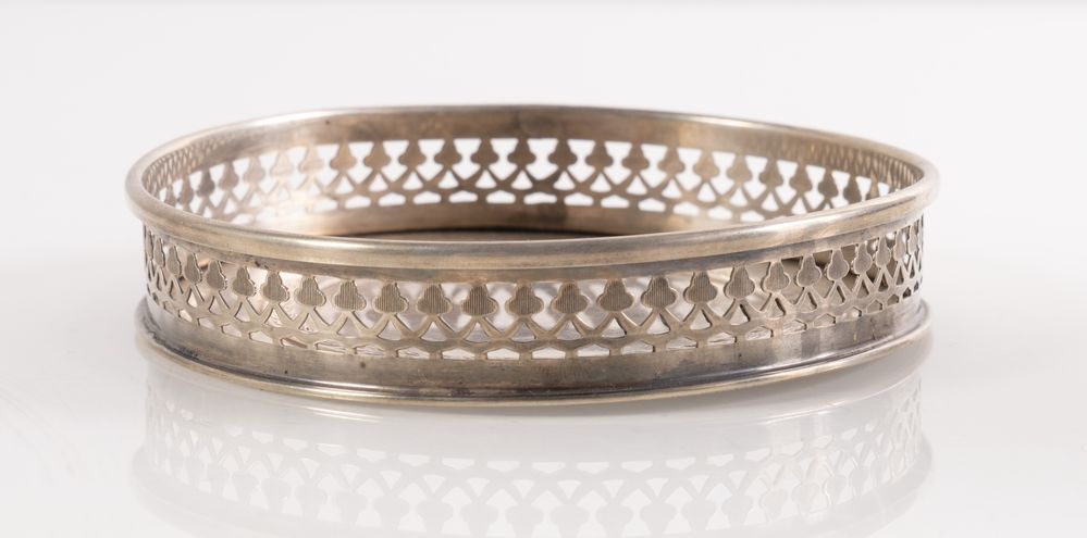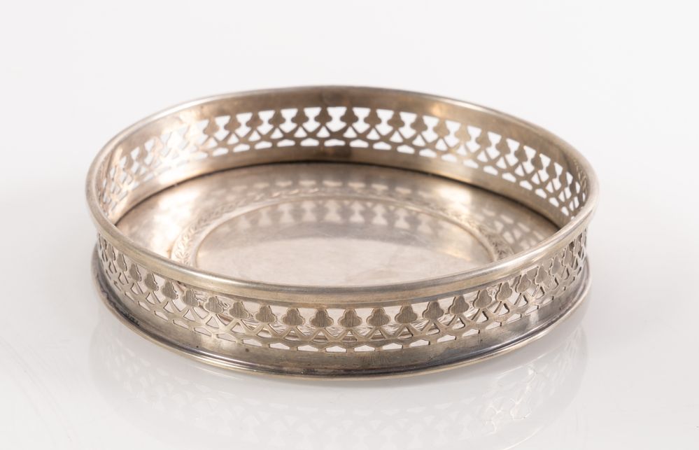 GREGGIO RINO, Padova, inizio del XX secolo. Sottobottiglia in argento 800.
