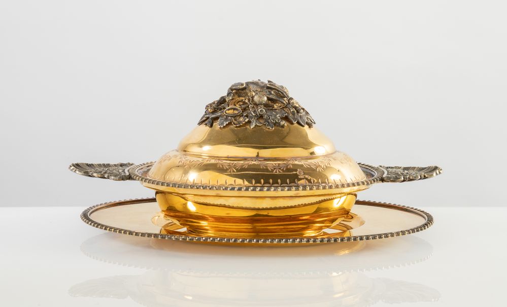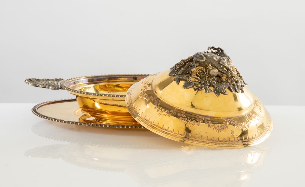 Ogni elemento della zuppiera reca punzoni russi con San Giorgio e il drago e 84.