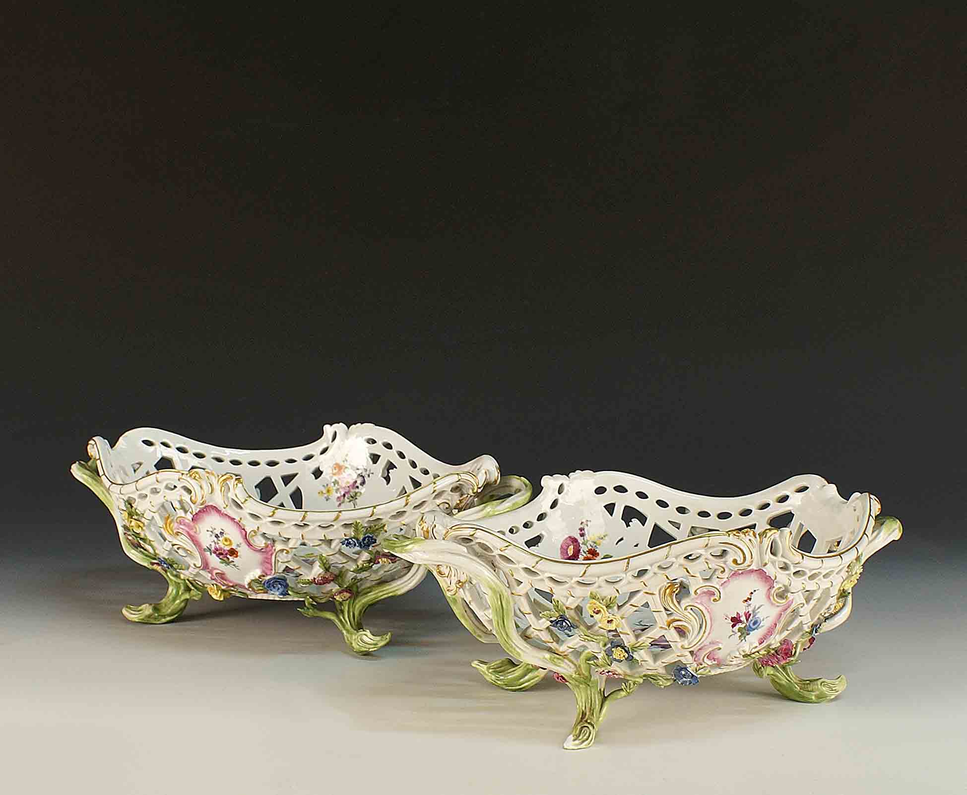 Coppia di cesti traforati in porcellana bianca dipinta in policromia e decorata a motivo floreale e con fiori in rilievo, poggianti su quattro piedini, Meissen, prima metà del XIX secolo, cm. 12x32x21.