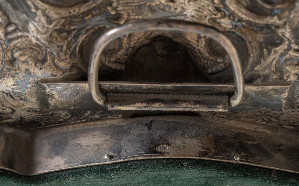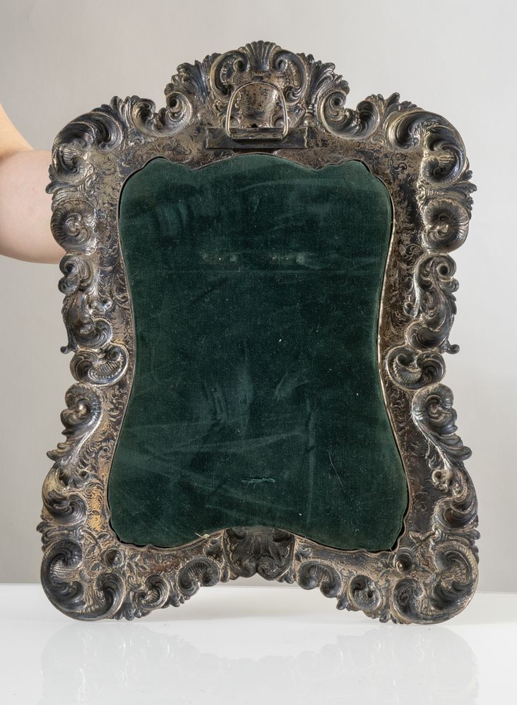 Italia, XX secolo. Specchio con cornice in argento 800, riccamente decorata.
