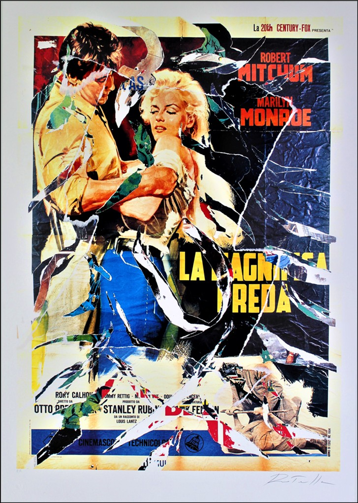 ROTELLA MIMMO Catanzaro 1918 - Milano 2006 "La magnifica preda" Multiplo decollage con strappi di manifesto applicati su supporto serigrafico su cartoncino, cm 70x100. Firmato in basso a destra e numerato a sinistra, esemplare XXXII/L. Timbro a secco Fondazione Rotella Mimmo in basso a sinistra. Opera pubblicata sul catalogo "Mimmo Rotella multipli decollage", Silvana Editoriale, a pag. 84 e 85.