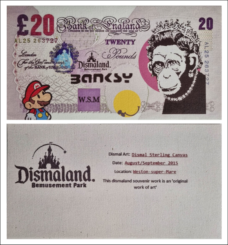 BANKSY Regno Unito XX sec. "Dismal sterling" Serigrafia su tela cm 25x14 del 2015. Fornita con biglietto d'ingresso e mappa del parco Dismaland. Edizione Limitata.