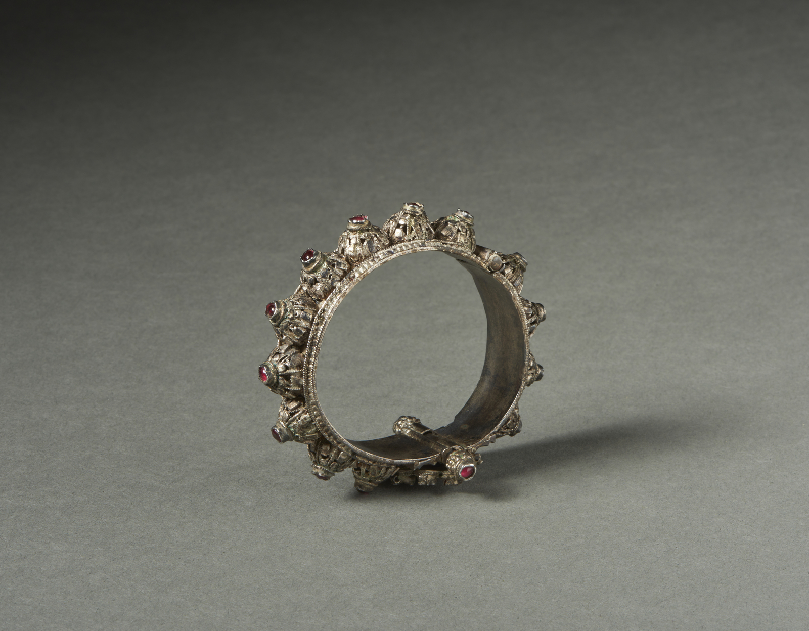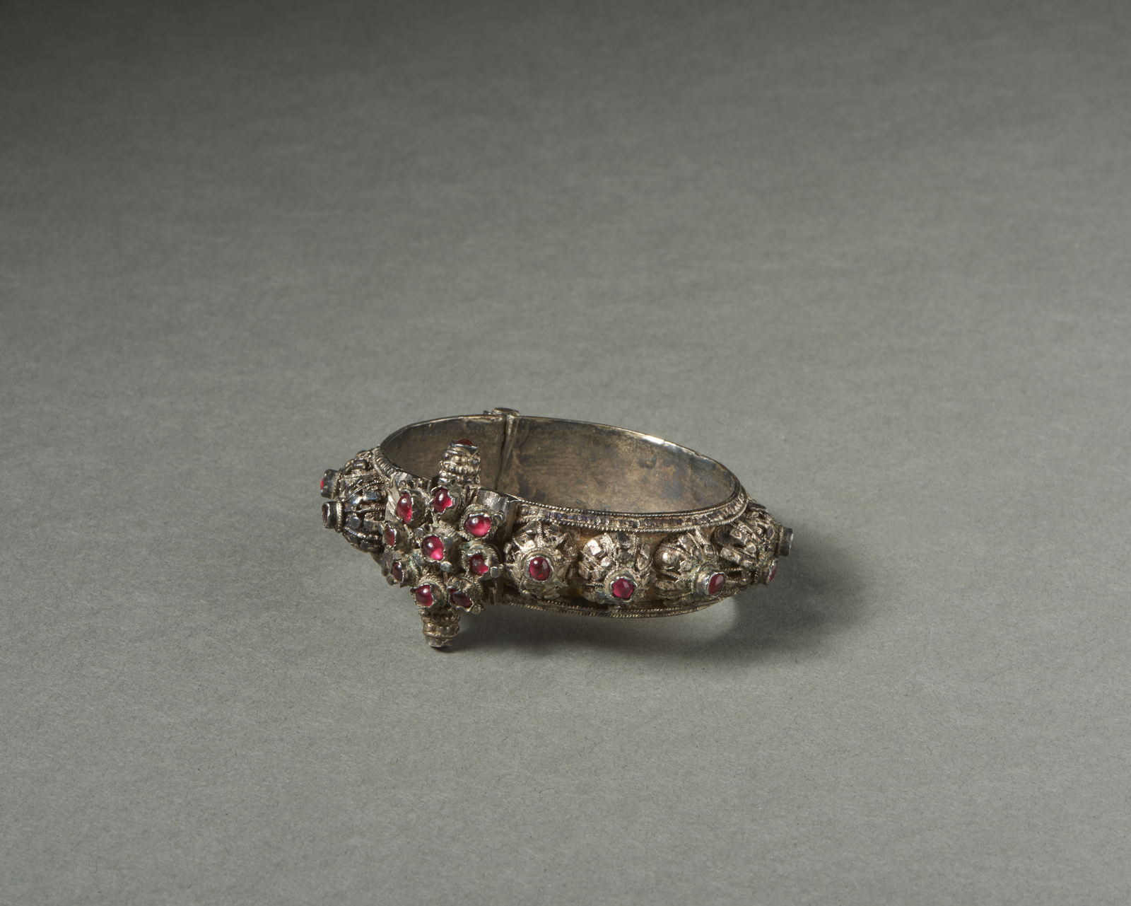Arte Indiana - India. Bracciale con chiusura a vite. Argento in filigrana e paste vitree o granati. .