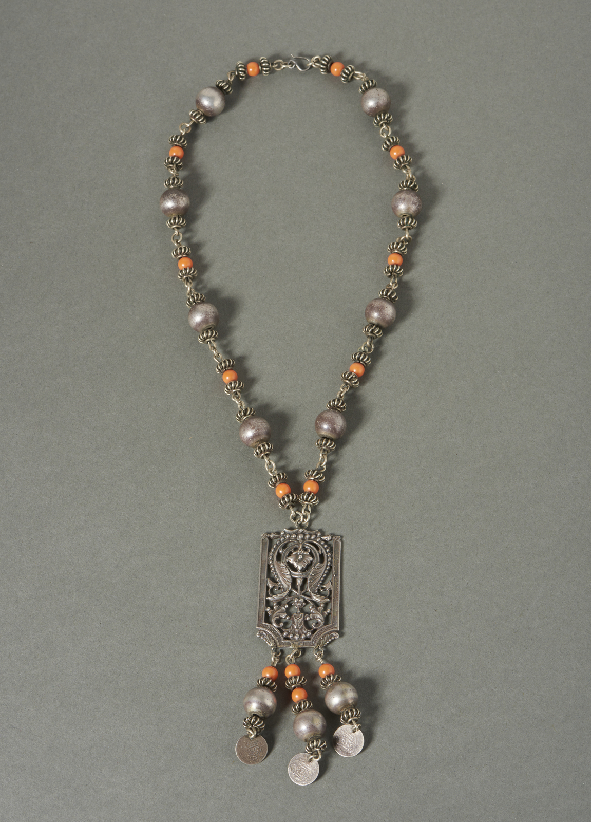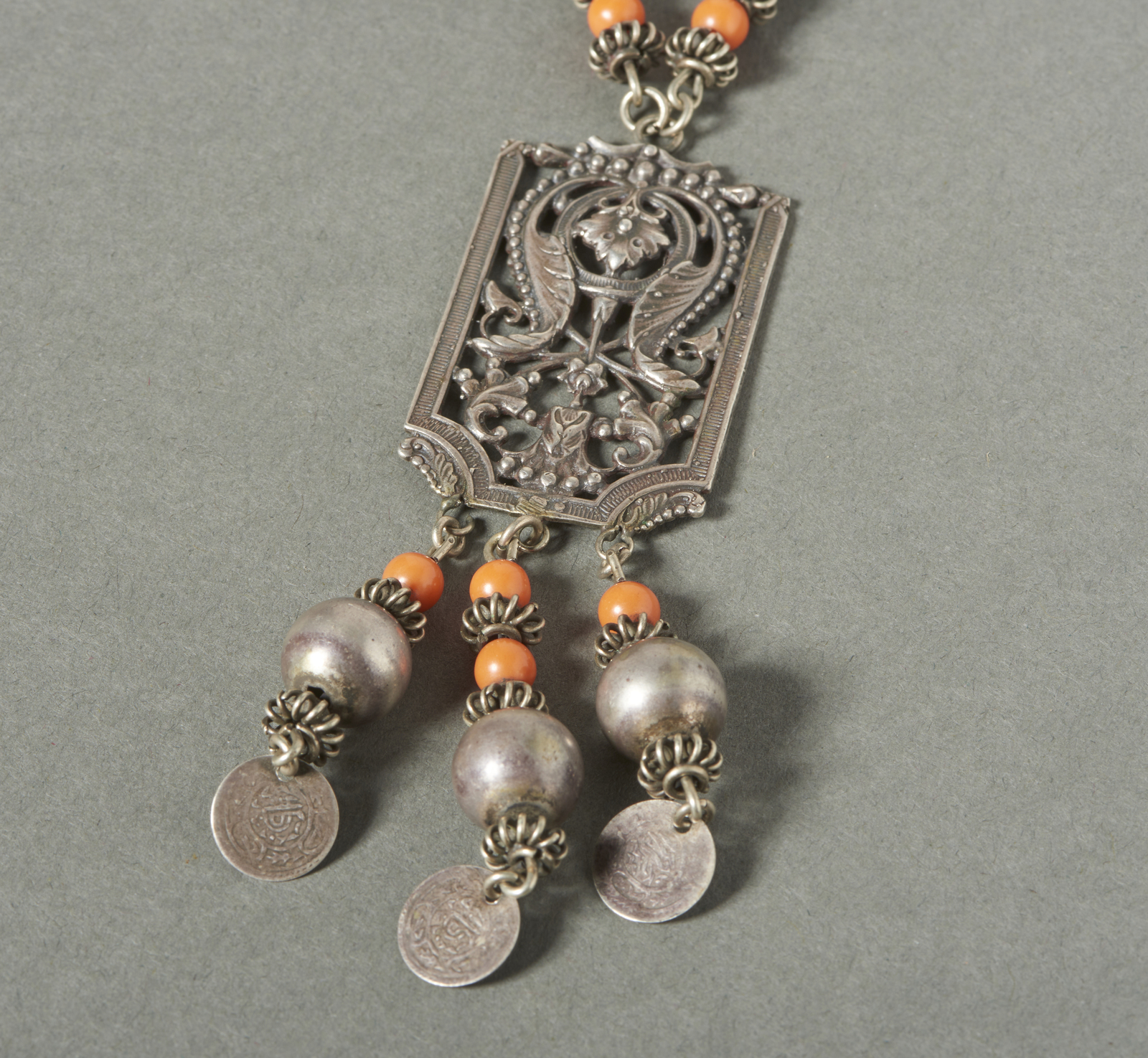 Collana in argento, paste vitree e corallo. . . Cm 3,50 x 33,00 x 1,00. Collana delle regioni himalayane, in argento, corallo e paste vitree, con placca centrale pendente lavorata ed incisa a raffinati motivi geometrici e floreali.