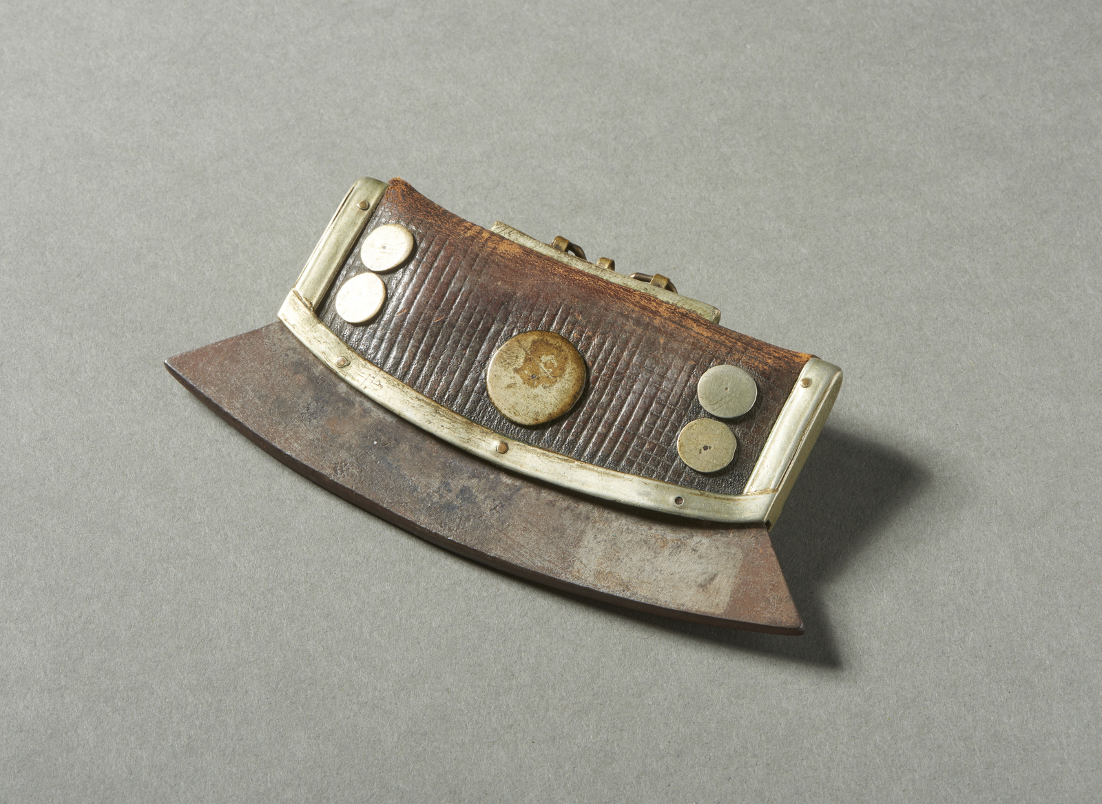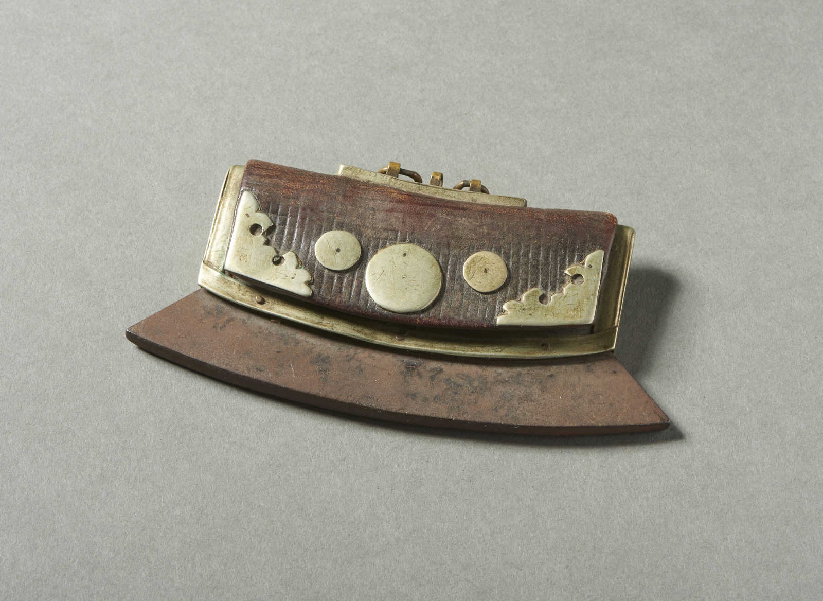 Arte Tibetana - Tibet. Borsellino/ insegna di rango e necessaire per accendere il fuoco. Ferro, cuoio, rame e lega d'argento. Segni d'uso.
