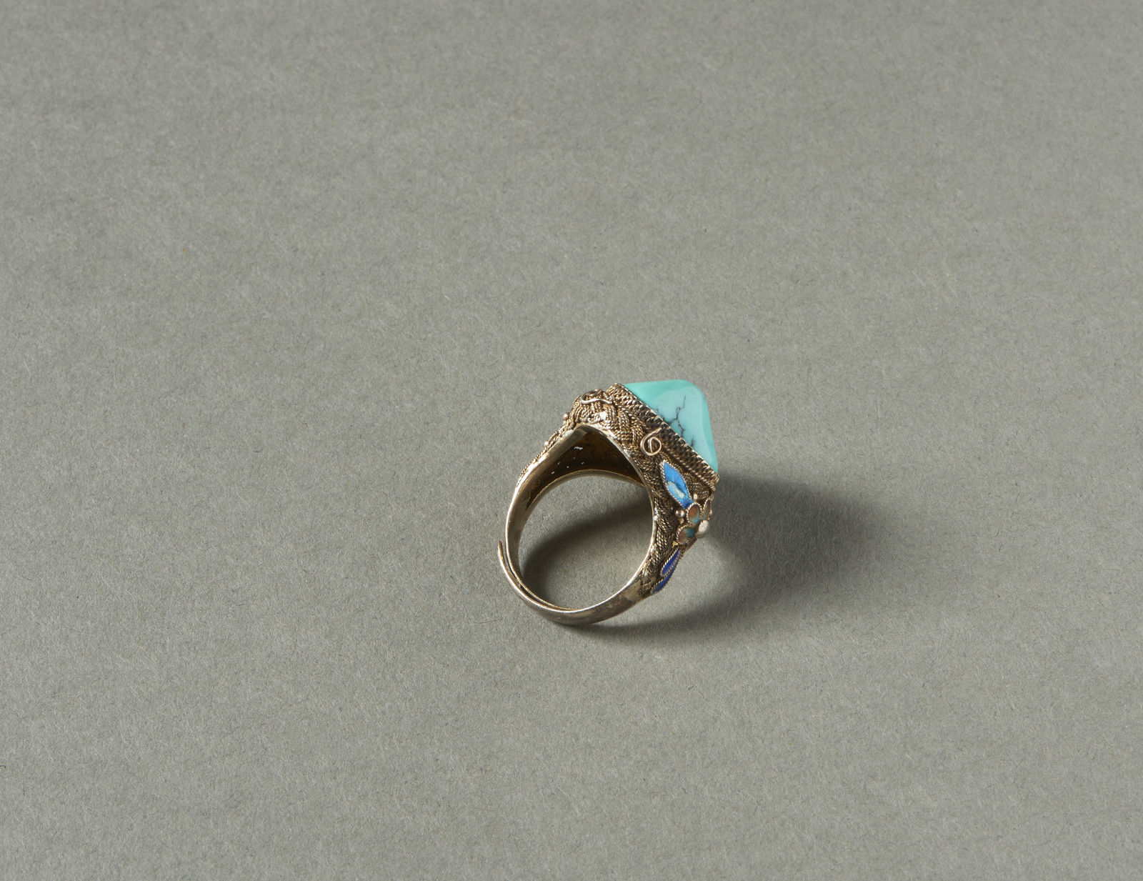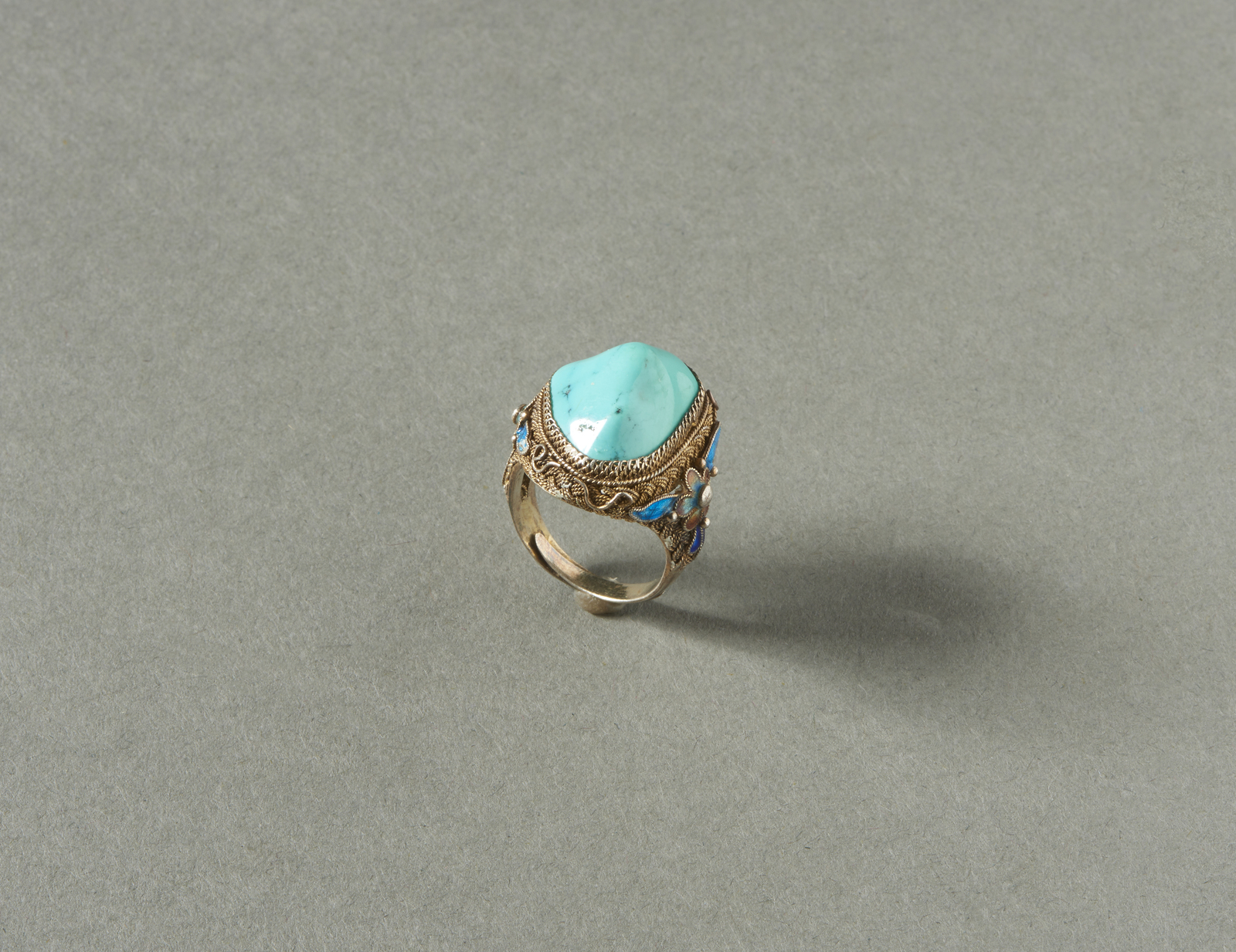 Lot 91 | Arte Cinese - Cina. Anello in argento lavorato in filigrana e dorato, smalti e turchesi. .