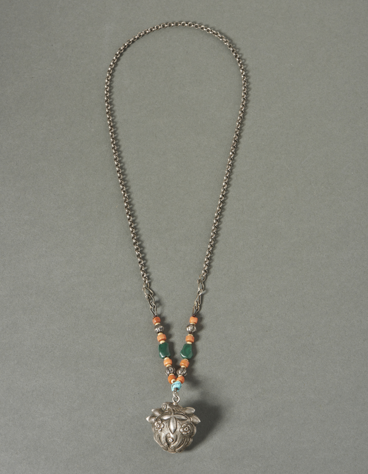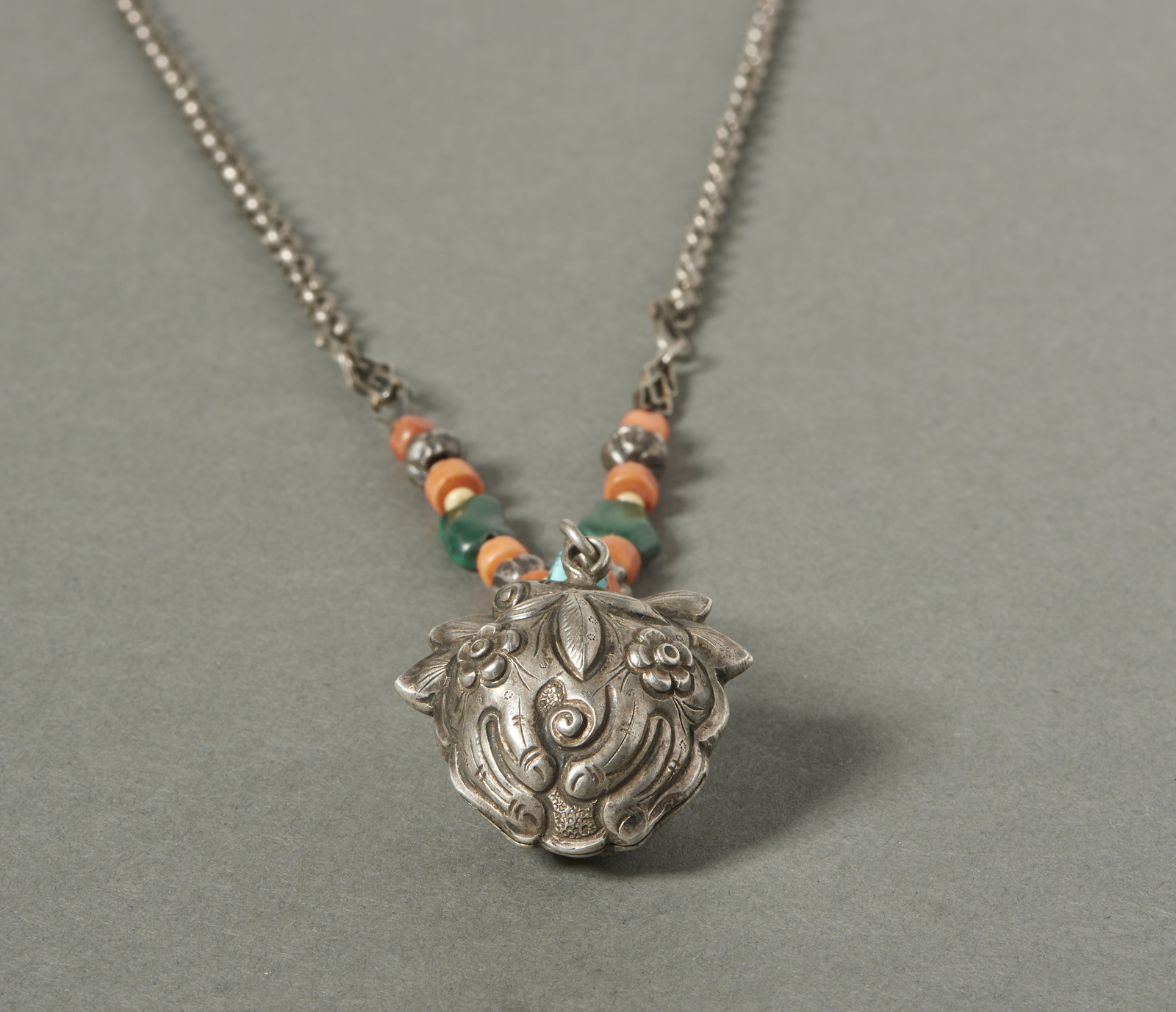 Arte Cinese - Cina. Collana con sonaglio. Argento e turchese, malachite, osso e corallo. Segni d'uso. .