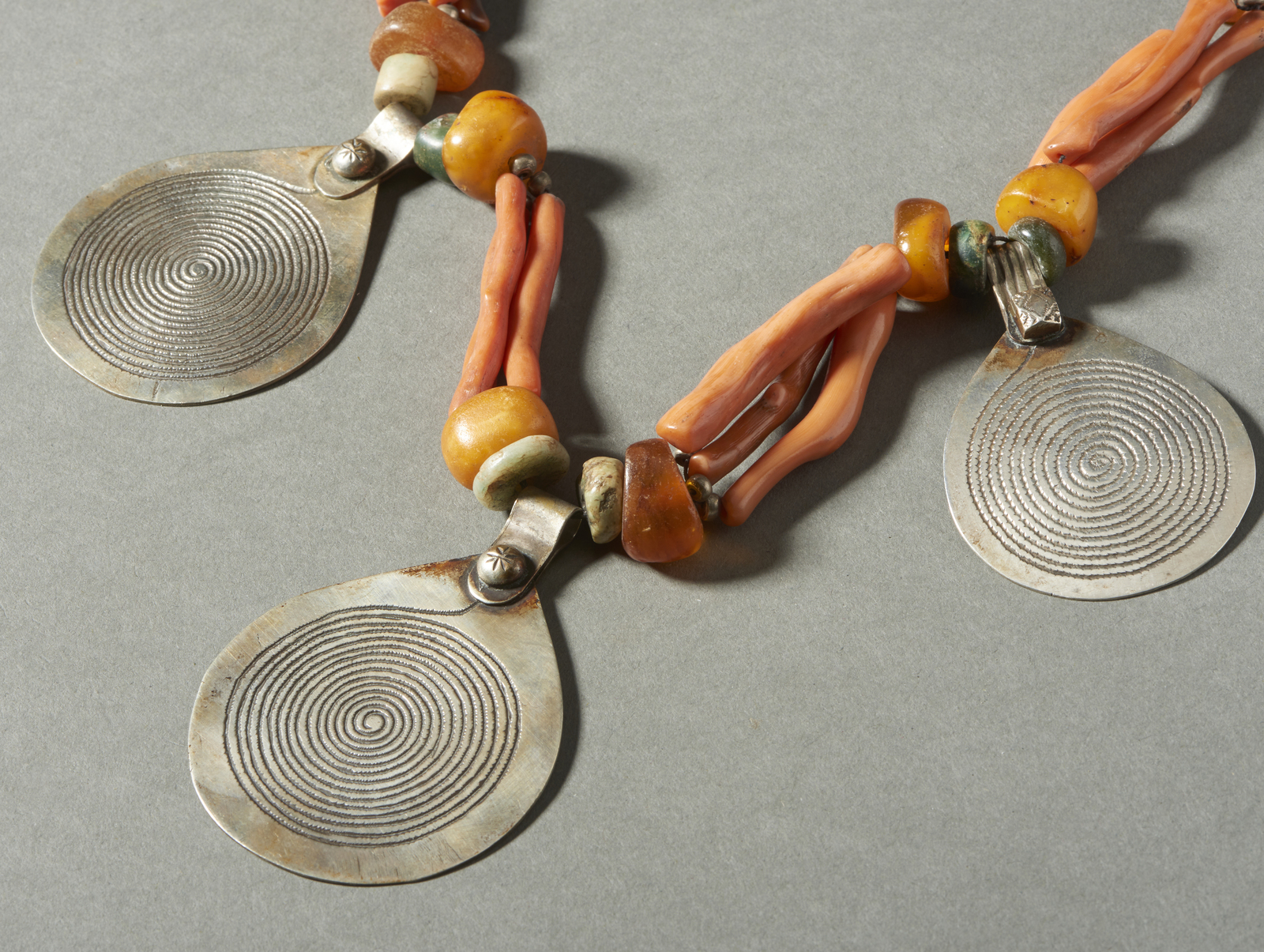 Arte africana - Berberi (Tiznit - Marocco) Collana da matrimonio corallo, ambra, pietre verdi e 5 placche rotonde con spirali d'argento. segni d'uso.
