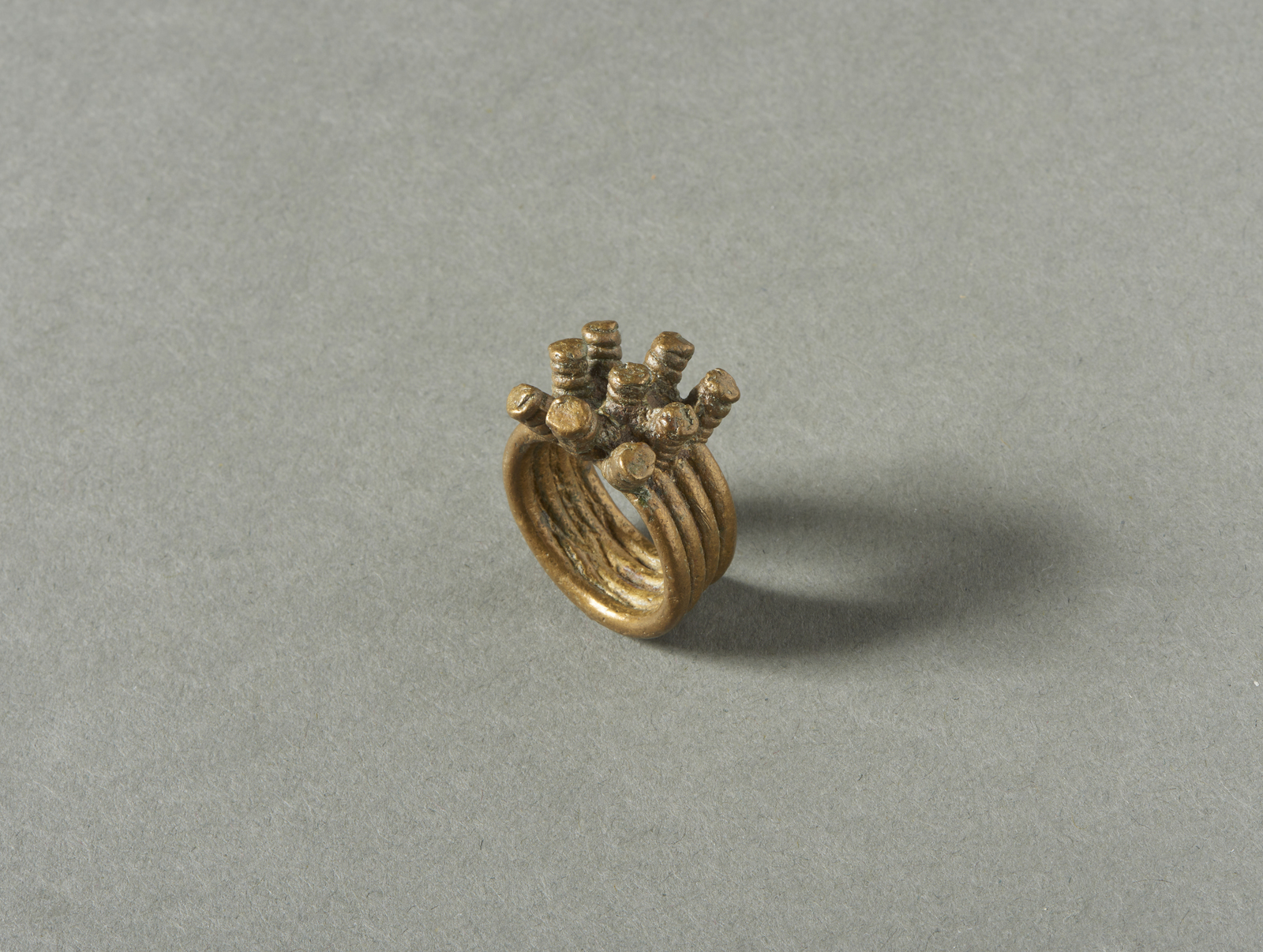 Segni d'uso. . . Cm 2,00 x 3,20 x 1,20. Anello in lega di rame a quattro canne piene con nove prominenze di forma fallica.